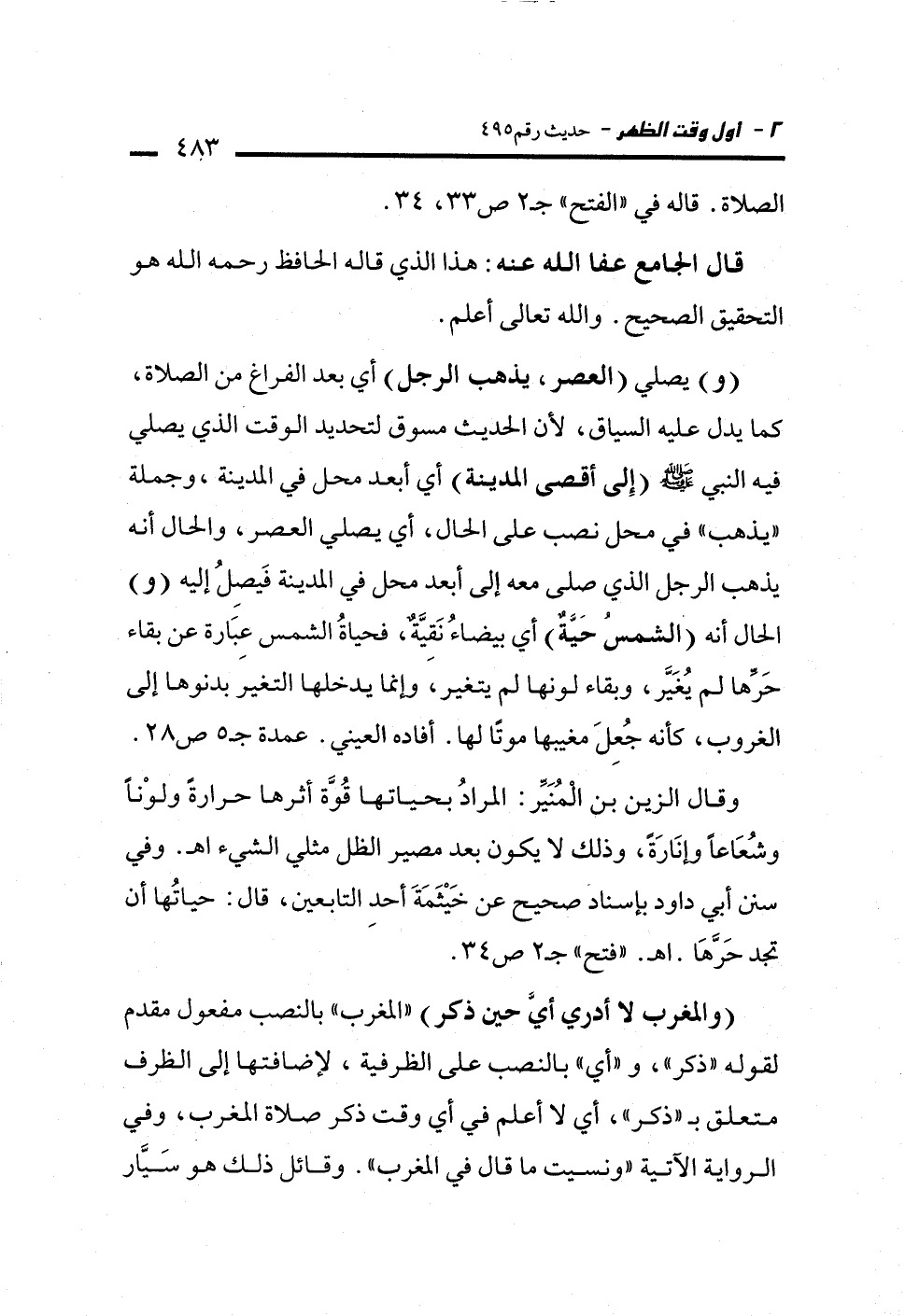 وقال الزين بن المُنَيِّر: المرادُ بحياتها قُوَّة أثرها حرارةً ولوْنًا وشُعَاعًا وإنَارَةً، وذلك لا يكون بعد مصير الظل مثلي الشيء اهـ. وفي سنن أبي داود بإسناد صحيح عن خَيْثَمَةَ أحد التابعين، قال: حياتُها أن تجد حَرَّهَا. اهـ. "فتح" جـ 2 ص 34.