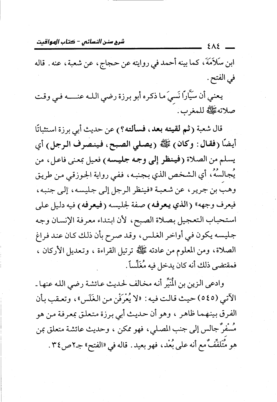 وادعى الزين بن المُنَيِّر أنه مخالف لحديث عائشة رضي الله عنها- الآتي (545) حيث قالت فيه: "لا يُعْرَفْن من الغَلَس"، وتعقب بأن الفرق بينهما ظاهر، وهو أن حديث أبي برزة متعلق بمعرفة من هو مُسْفِرٌ جالس إلى جنب المصلي، فهو ممكن، وحديث عائشة متعلق بمن هو مُتَلفِّفٌ مع أنه على بُعْد، فهو بعيد. قاله في "الفتح" جـ 2 ص 34.