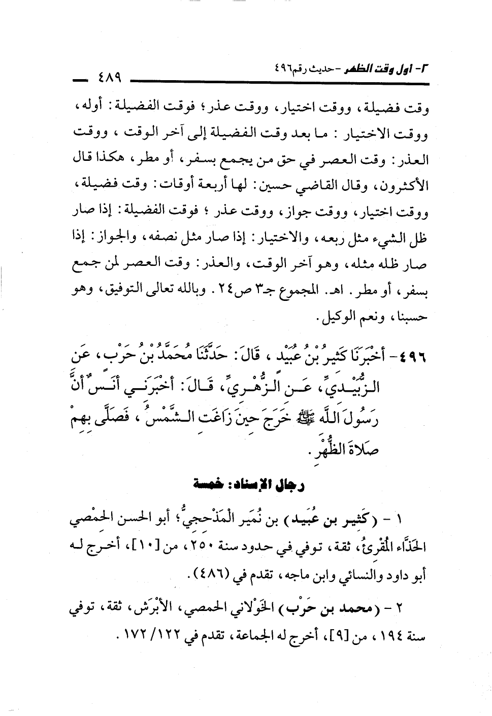 496 - أَخْبَرَنَا كَثِيرُ بْنُ عُبَيْدٍ، قَالَ: حَدَّثَنَا مُحَمَّدُ بْنُ حَرْبٍ، عَنِ الزُّبَيْدِيِّ، عَنِ الزُّهْرِيِّ، قَالَ: أَخْبَرَنِي أَنَسٌ أَنَّ رَسُولَ اللهِ - صلى الله عليه وسلم - خَرَجَ حِينَ زَاغَتِ الشَّمْسُ، فَصَلَّى بِهِمْ صَلاَةَ الظُّهْرِ.