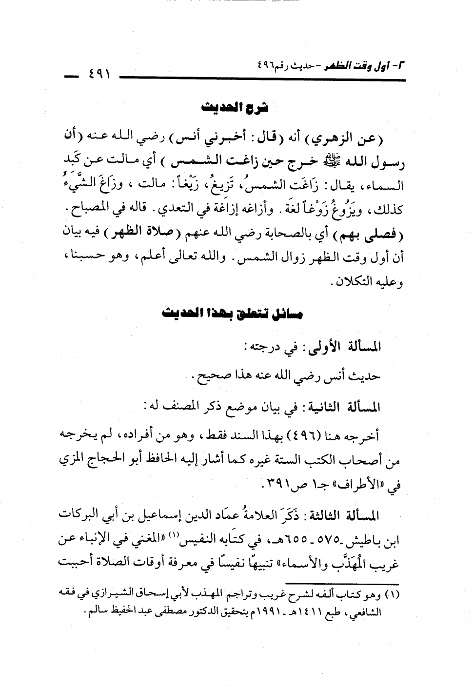 المسألة الثالثة: ذَكَرَ العلامةُ عمَاد الدين إسماعيل بن أبي البركات ابن باطيش -575 - 655 هـ، في كتَابه النفيس (¬1) "المغني في الإنباء عن غريب المُهَذَّب والأسماء" تنبيهًا نفيسًا في معرفة أوقات الصلاة أحببت