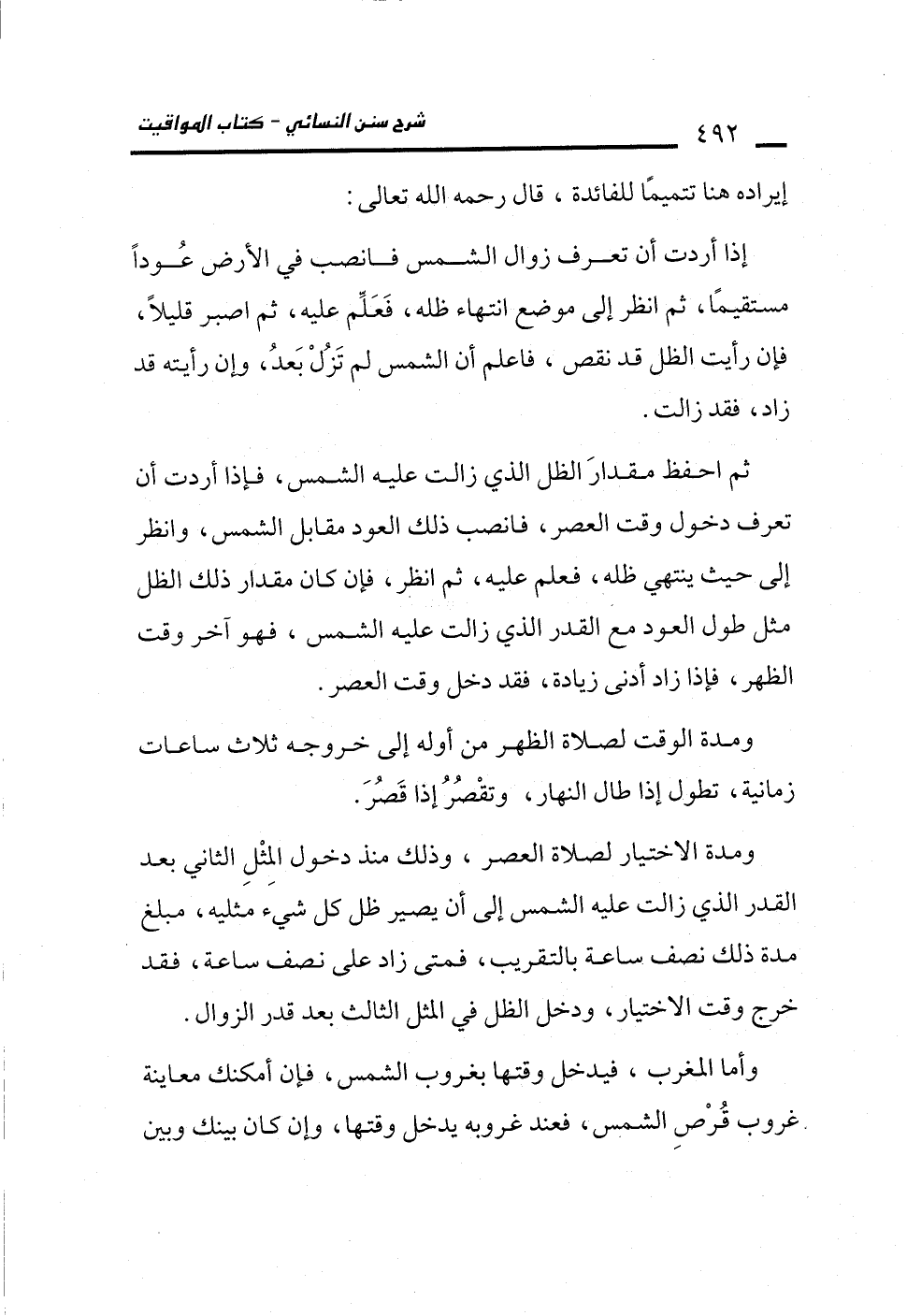 ثم احفظ مقدارَ الظل الذي زالت عليه الشمس، فإذا أردت أن تعرف دخول وقت العصر، فانصب ذلك العود مقابل الشمس، وانظر إلى حيث ينتهي ظله، فعلم عليه، ثم انظر، فإن كان مقدار ذلك الظل مثل طول العود مع القدر الذي زالت عليه الشمس، فهو آخر وقت