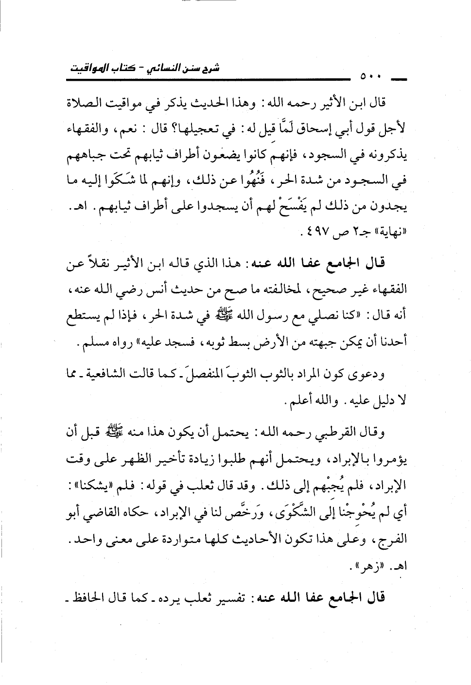 قال الجامع عفا الله عنه: هذا الذي قاله ابن الأثير نقلًا عن الفقهاء غير صحيح، لمخالفته ما صح من حديث أنس رضي الله عنه، أنه قال: "كنا نصلي مع رسول الله - صلى الله عليه وسلم - في شدة الحر، فإذا لم يستطع أحدنا أن يمكن جبهته من الأرض بسط ثوبه، فسجد عليه" رواه مسلم.