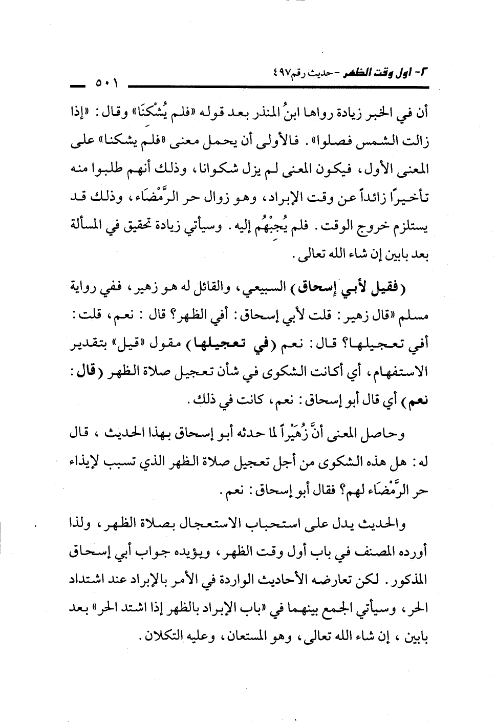 أن في الخبر زيادة رواها ابنُ المنذر بعد قوله "فلم يُشْكنَا" وقال: "إذا زالت الشمس فصلوا". فالأولى أن يحمل معنى "فلم يشكنا" على المعنى الأول، فيكون المعنى لم يزل شكوانا، وذلك أنهم طلبوا منه تأخيرًا زائدًا عن وقت الإبراد، وهو زوال حر الرَّمْضَاء، وذلك قد يستلزم خروج الوقت. فلم يُجِبْهُم إليه. وسيأتي زيادة تحقيق في المسألة بعد بابين إن شاء الله تعالى.