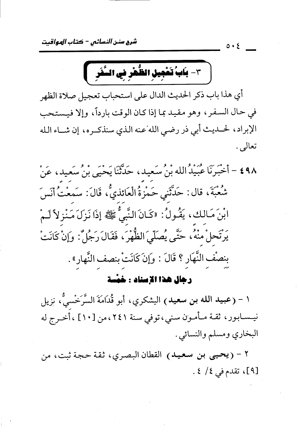 498 - أَخْبَرَنَا عُبَيْدُ اللهِ بْنُ سَعِيدٍ، حَدَّثَنَا يَحْيَى بْنُ سَعِيدٍ، عَنْ شُعْبَةَ، قَالَ: حَدَّثَنِي حَمْزَةُ الْعَائِذِيُّ، قَالَ: سَمِعْتُ أَنَسَ بْنَ مَالِكٍ، يَقُولُ: "كَانَ النَّبِيُّ - صلى الله عليه وسلم - إِذَا نَزَلَ مَنْزِلاً لَمْ يَرْتَحِلْ مِنْهُ، حَتَّى يُصَلِّىَ الظُّهْرَ، فَقَالَ رَجُلٌ: وَإِنْ كَانَتْ بِنِصْفِ النَّهَارِ؟ قَالَ: وَإِنْ كَانَتْ بِنِصْفِ النَّهَارِ".