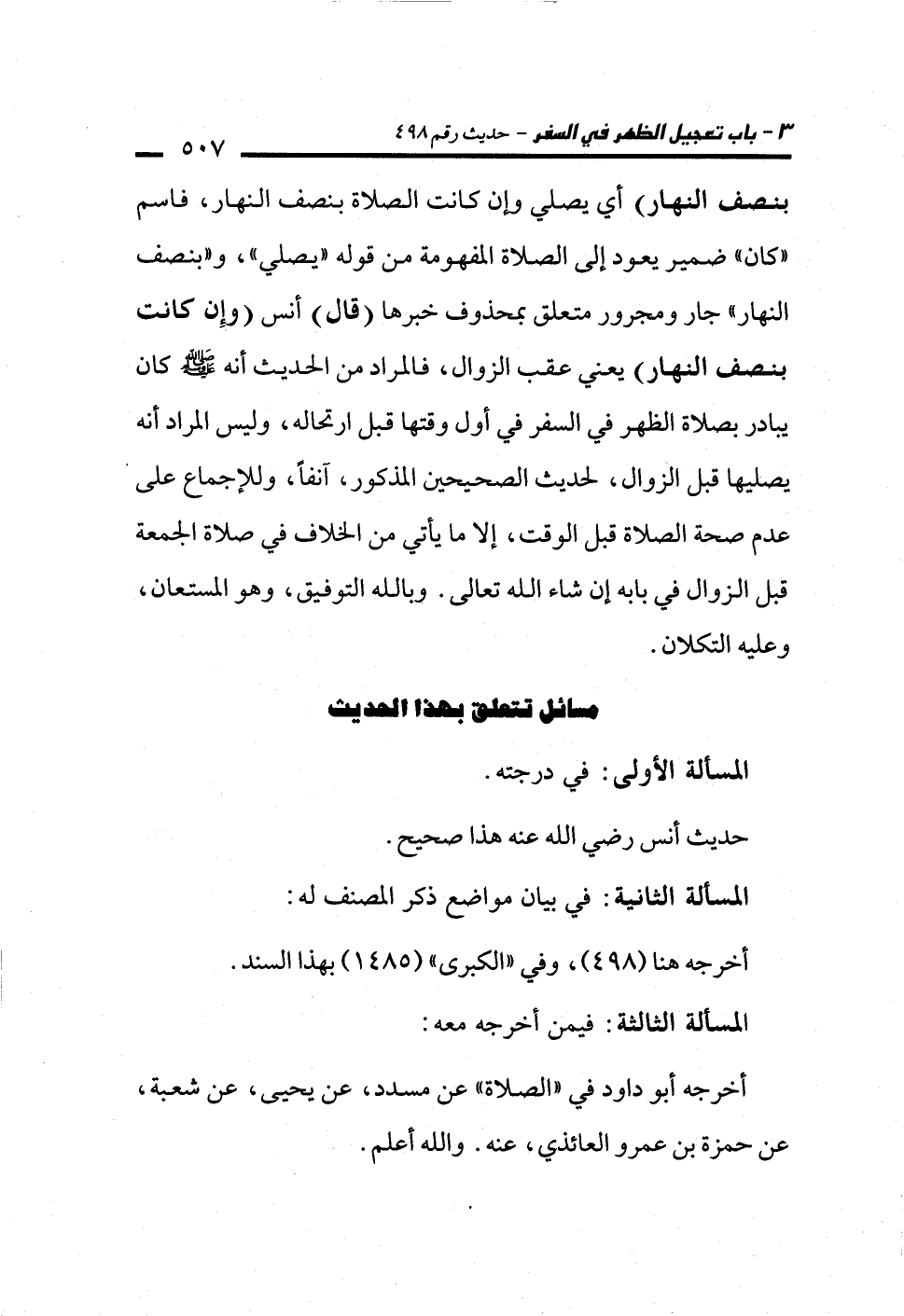 بنصف النهار) أي يصلي وإن كانت الصلاة بنصف النهار، فاسم "كان" ضمير يعود إلى الصلاة المفهومة من قوله "يصلي"، و"بنصف النهار" جار ومجرور متعلق بمحذوف خبرها (قال) أنس (وإِن كانت بنصف النهار) يعني عقب الزوال، فالمراد من الحديث أنه - صلى الله عليه وسلم - كان يبادر بصلاة الظهر في السفر في أول وقتها قبل ارتحاله، وليس المراد أنه يصليها قبل الزوال، لحديث الصحيحين المذكور، آنفًا، وللإجماع على عدم صحة الصلاة قبل الوقت، إلا ما يأتي من الخلاف في صلاة الجمعة قبل الزوال في بابه إن شاء الله تعالى. وبالله التوفيق، وهو المستعان، وعليه التكلان.