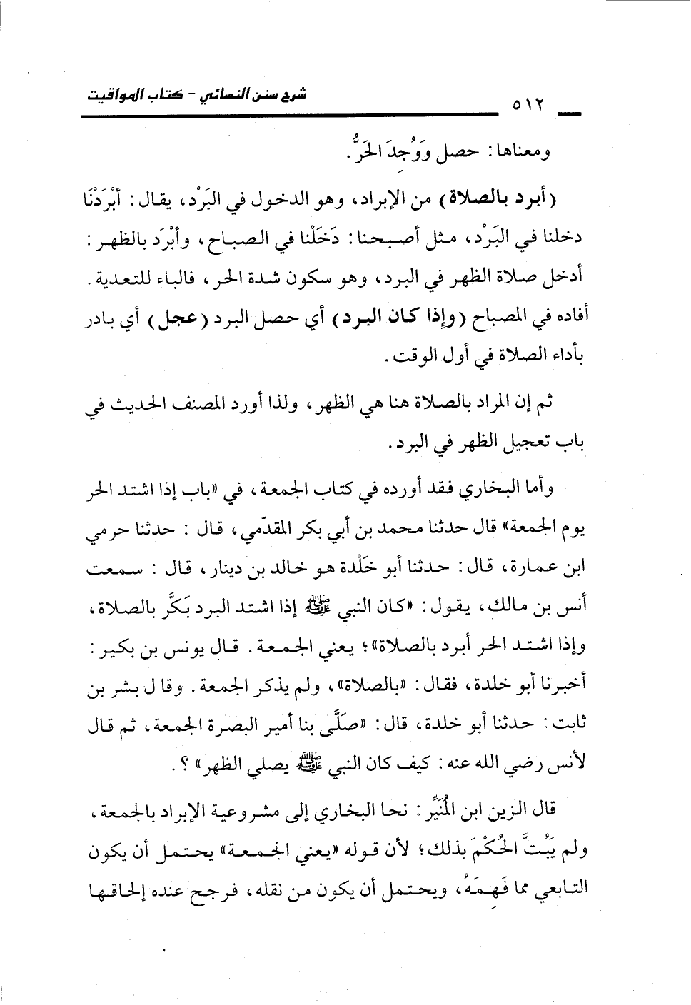 وأما البخاري فقد أورده في كتاب الجمعة، في "باب إذا اشتد الحر يوم الجمعة" قال حدثنا محمد بن أبي بكر المقدّمي، قال: حدثنا حرمي بن عمارة، قال: حدثنا أبو خَلْدة هو خالد بن دينار، قال: سمعت أنس بن مالك، يقول: "كان النبي - صلى الله عليه وسلم - إذا اشتد البرد بَكَّر بالصلاة، وإذا اشتد الحر أبرد بالصلاة"، يعني الجمعة. قال يونس بن بكير: أخبرنا أبو خلدة، فقال: "بالصلاة"، ولم يذكر الجمعة. وقال بشر بن ثابت: حدثنا أبو خلدة، قال: "صَلَّى بنا أمير البصرة الجمعة، ثم قال لأنس رضي الله عنه: كيف كان النبي - صلى الله عليه وسلم - يصلي الظهر"؟.