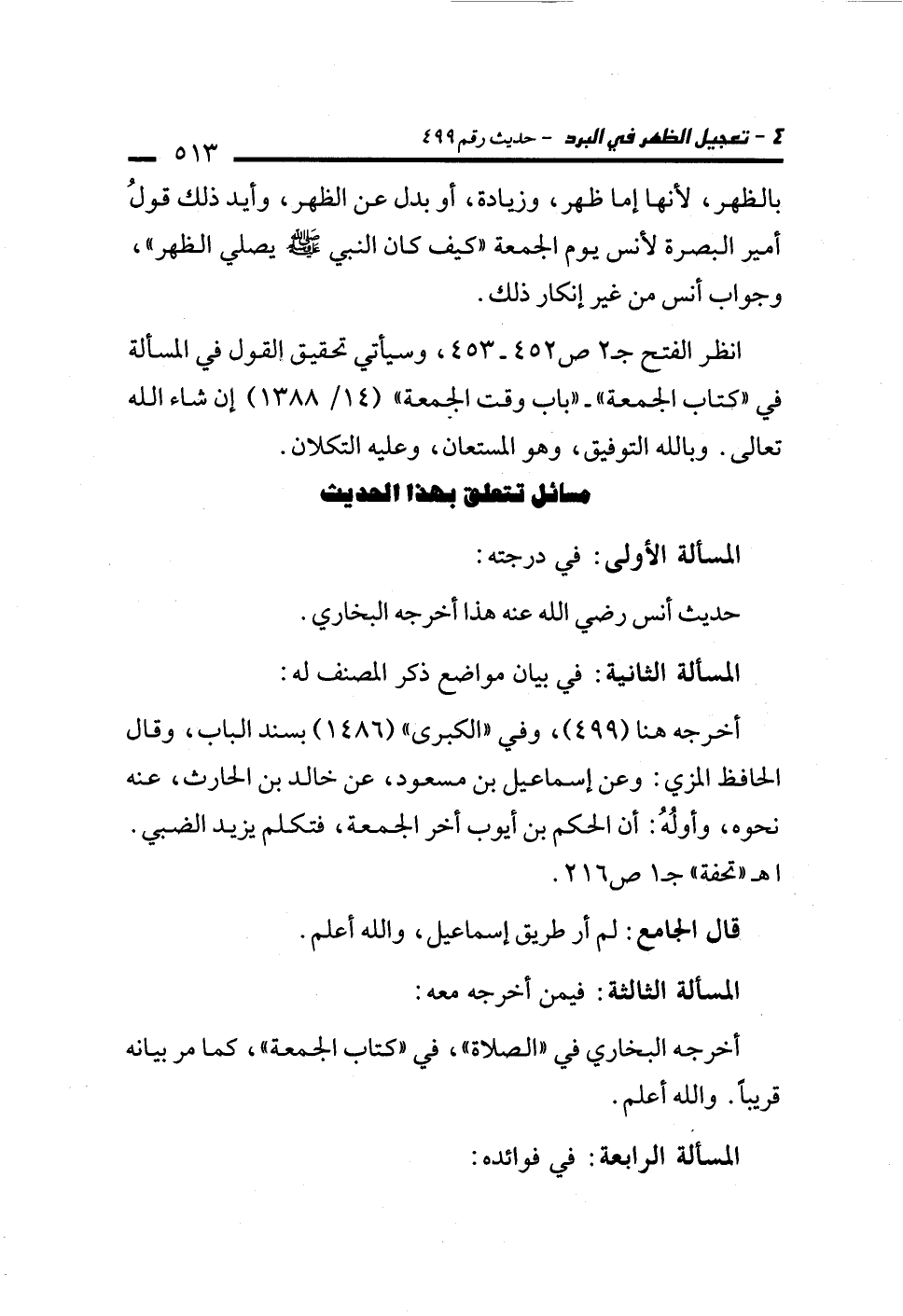 انظر الفتح جـ 2 ص 452 - 453، وسيأتي تحقيق القول في المسألة في "كتاب الجمعة"- "باب وقت الجمعة" (14/ 1388) إن شاء الله تعالى. وبالله التوفيق، وهو المستعان، وعليه التكلان.