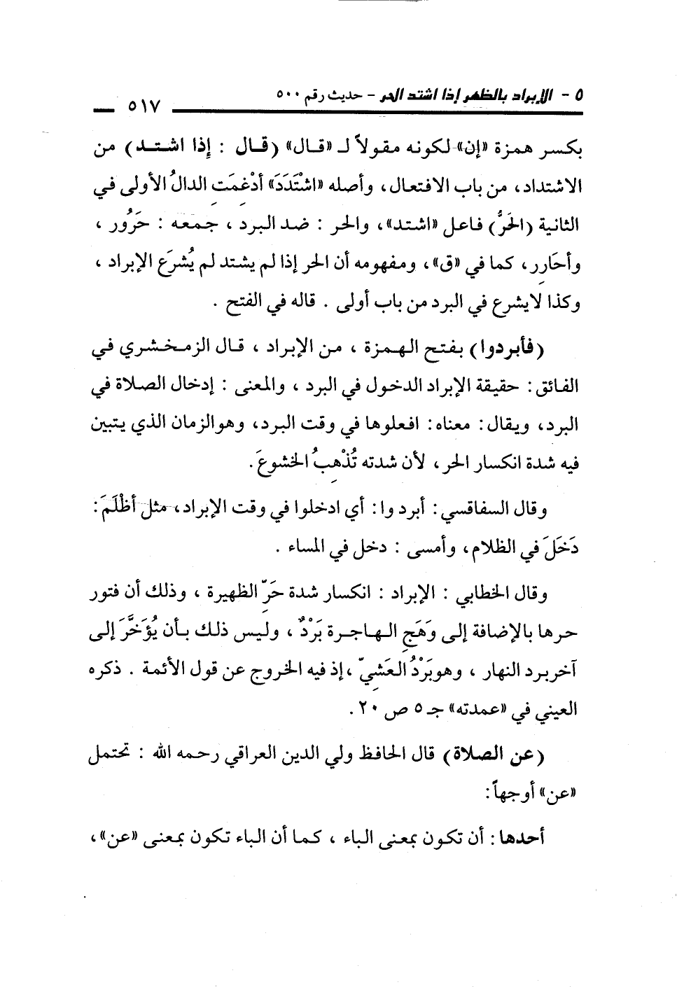 وقال الخطابي: الإبراد: انكسار شدة حَرِّ الظهيرة، وذلك أن فتور حرها بالإضافة إلى وَهَجِ الهاجرة بَرْدٌ، وليس ذلك بأن يُؤَخَّرَ إلى آخر برد النهار، وهو بَرْدُ العَشِيّ، إذ فيه الخروج عن قول الأئمة. ذكره العيني في "عمدته" جـ 5 ص 20.
