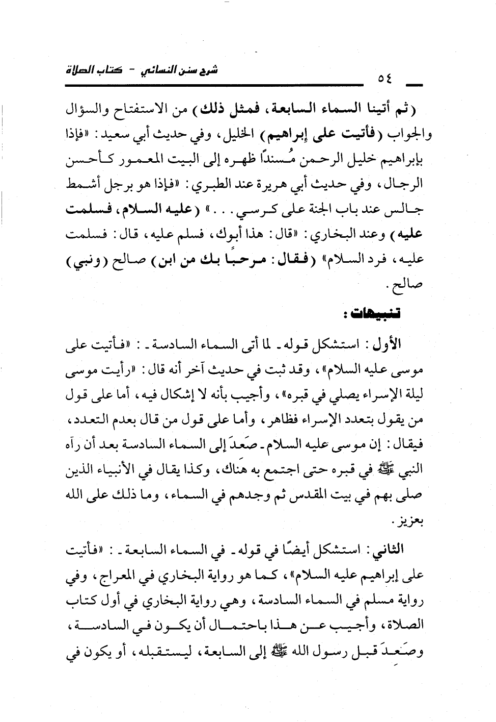 الثاني: استشكل أيضًا في قوله -في السماء السابعة-: "فأتيت على إبراهيم عليه السلام"، كما هو رواية البخاري في المعراج، وفي رواية مسلم في السماء السادسة، وهي رواية البخاري في أول كتاب الصلاة، وأجيب عن هذا باحتمال أن يكون في السادسة، وصَعِدَ قبل رسول الله - صلى الله عليه وسلم - إلى السابعة، ليستقبله، أو يكون في