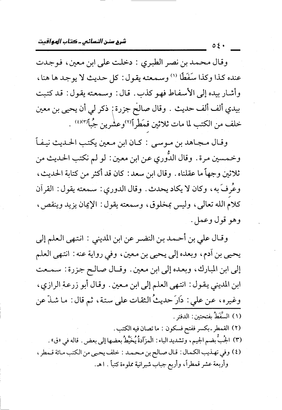 وقال محمد بن نصر الطبري: دخلت على ابن معين، فوجدت عنده كذا وكذا سَفَطًا (¬1) وسمعته يقول: كل حديث لا يوجد ها هنا، وأشار بيده إلى الأسفاط فهو كذب. قال: وسمعته يقول: قد كتبت بيدي ألف ألف حديث. وقال صالخ جزرة: ذكر لي أن يحيى بن معين خلف من الكتب لما مات ثلاثين قِمَطرًا (¬2) وعشرين جُبًا (¬3) (¬4).