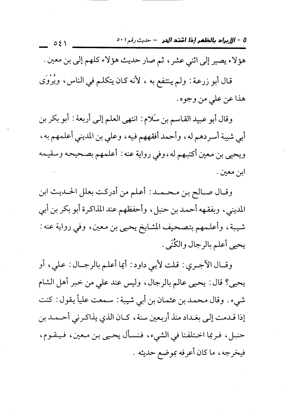 وقال أبو عبيد القاسم بن سَلام: انتهى العلم إلى أربعة: أبو بكر بن أبي شيبة أسردهم له، وأحمد أفقههم فيه، وعلي بن المديني أعلمهم به، ويحيى بن معين أكتبهم له، وفي رواية عنه: أعلمهم بصحيحه وسقيمه ابن معين.