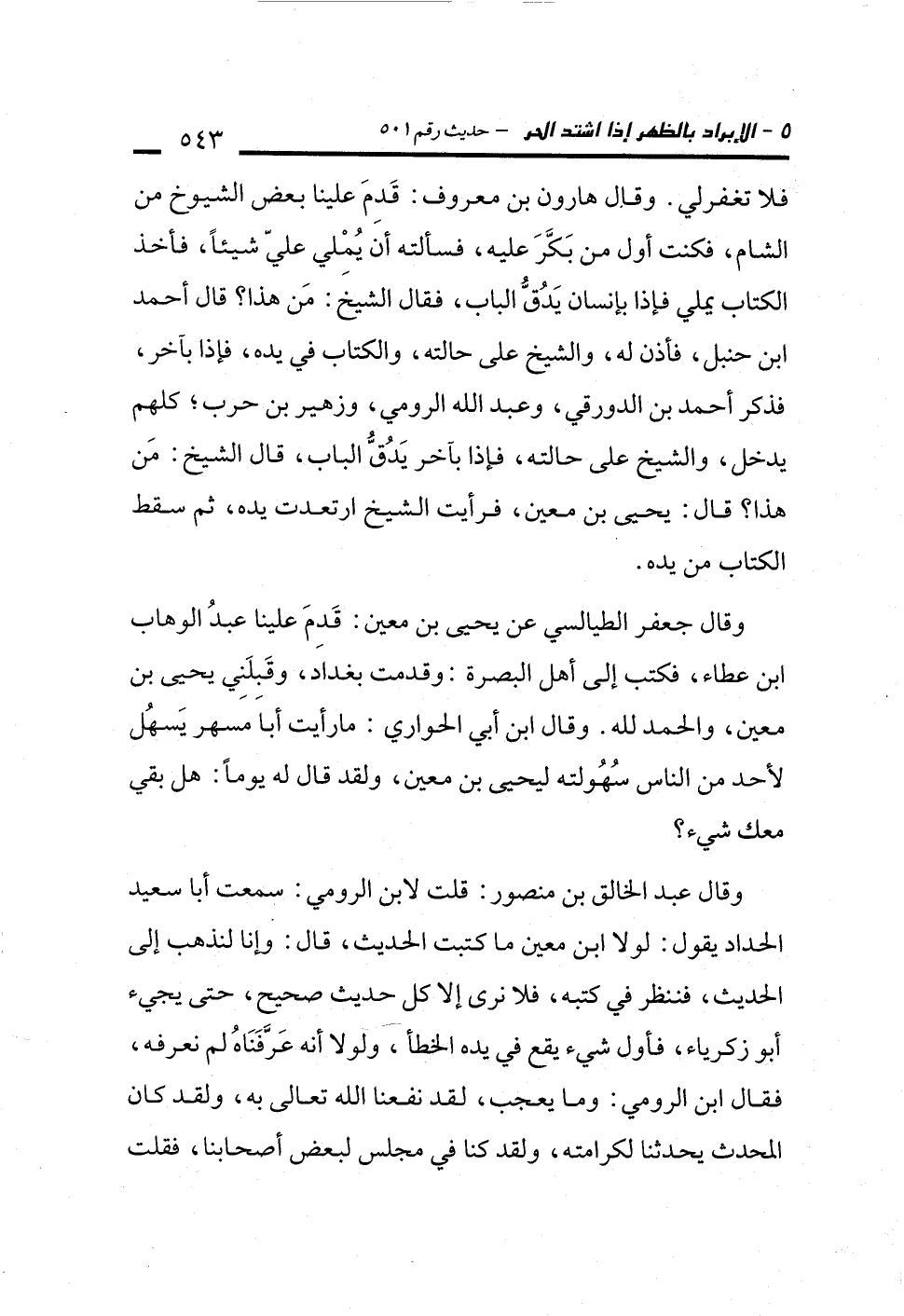 فلا تغفر لي. وقال هارون بن معروف: قَدِمَ علينا بعض الشيوخ من الشام، فكنت أول من بَكَّرَ عليه، فسألته أنَ يُمْلي عليّ شيئًا، فأخذ الكتاب يصلي فإذا بإنسان يَدُقُّ الباب، فقال الشيخَ: مَن هذا؟ قال أحمد بن حنبل، فأذن له، والشيخ على حالته، والكتاب في يده، فإذا بآخر، فذكر أحمد بن الدورقي، وعبد الله الرومي، وزهير بن حرب، كلهم يدخل، والشيخ على حالته، فإذا بآخر يَدُقّ الباب، قال الشيخ: مَن هذا؟ قال: يحيى بن معين، فرأيت الشيخ ارتعدت يده، ثم سقط الكتاب من يده.
