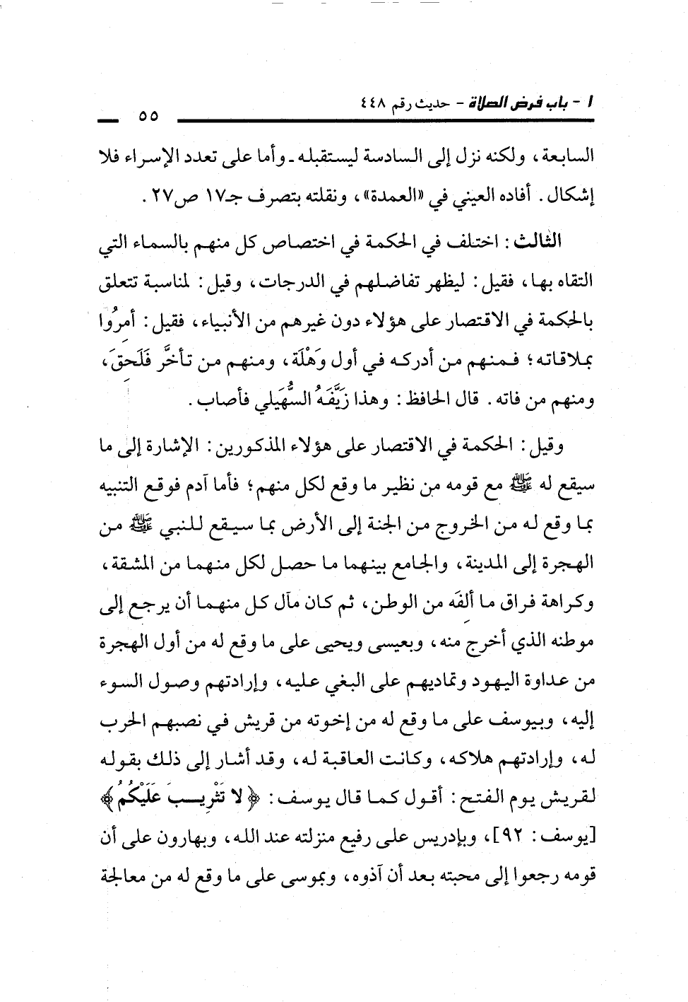 الثالث: اختلف في الحكمة في اختصاص كل منهم بالسماء التي التقاه بها، فقيل: ليظهر تفاضلهم في الدرجات، وقيل: لمناسبة تتعلق بالحكمة في الاقتصار على هؤلاء دون غيرهم من الأنبياء، فقيل: أمرُوا بملاقاته؛ فمنهم من أدركه في أول وَهْلَة، ومنهم من تأخَّر فَلَحِقَ،