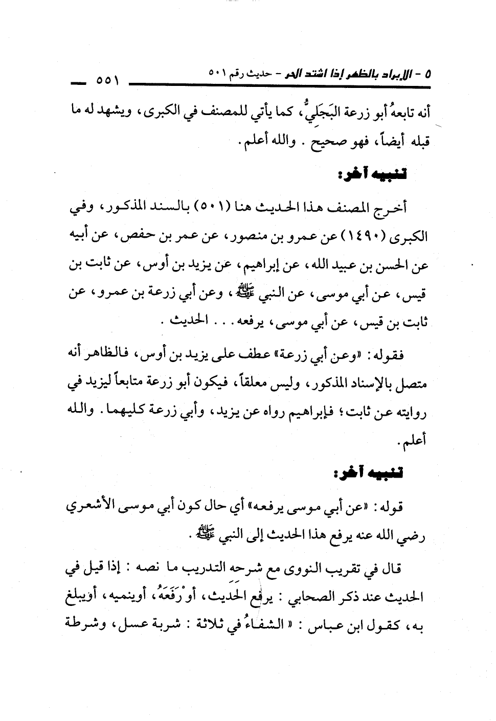 أخرج المصنف هذا الحديث هنا (501) بالسند المذكور، وفي الكبرى (1490) عن عمرو بن منصور، عن عمر بن حفص، عن أبيه عن الحسن بن عبيد الله، عن إبراهيم، عن يزيد بن أوس، عن ثابت بن قيس، عن أبي موسى، عن النبي - صلى الله عليه وسلم -، وعن أبي زرعة بن عمرو، عن