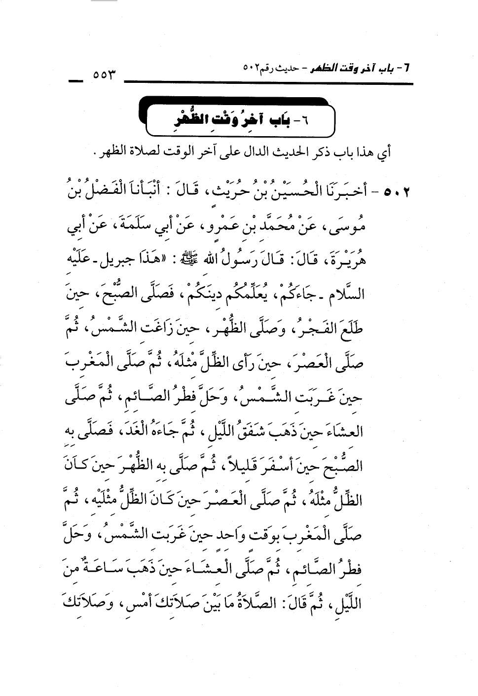 502 - أَخْبَرَنَا الْحُسَيْنُ بْنُ حُرَيْثٍ، قَالَ: أَنْبَأَنَا الْفَضْلُ بْنُ مُوسَى، عَنْ مُحَمَّدِ بْنِ عَمْرٍو، عَنْ أَبِي سَلَمَةَ، عَنْ أَبِي هُرَيْرَةَ، قَالَ: قَالَ رَسُولُ اللهِ - صلى الله عليه وسلم -: "هَذَا جِبْرِيلُ -عَلَيْهِ السَّلاَمُ- جَاءَكُمْ، يُعَلِّمُكُمْ دِينَكُمْ، فَصَلَّى الصُّبْحَ، حِينَ طَلَعَ الْفَجْرُ، وَصَلَّى الظُّهْرَ، حِينَ زَاغَتِ الشَّمْسُ، ثُمَّ صَلَّى الْعَصْرَ، حِينَ رَأَى الظِّلَّ مِثْلَهُ، ثُمَّ صَلَّى الْمَغْرِبَ، حِينَ غَرَبَتِ الشَّمْسُ، وَحَلَّ فِطْرُ الصَّائِمِ، ثُمَّ صَلَّى الْعِشَاءَ حِينَ ذَهَبَ شَفَقُ اللَّيْلِ، ثُمَّ جَاءَهُ الْغَدَ، فَصَلَّى بِهِ الصُّبْحَ حِينَ أَسْفَرَ قَلِيلاً، ثُمَّ صَلَّى بِهِ الظُّهْرَ حِينَ كَانَ الظِّلُّ مِثْلَهُ، ثُمَّ صَلَّى الْعَصْرَ حِينَ كَانَ الظِّلُّ مِثْلَيْهِ، ثُمَّ صَلَّى الْمَغْرِبَ بِوَقْتٍ وَاحِدٍ حِينَ غَرَبَتِ الشَّمْسُ، وَحَلَّ فِطْرُ الصَّائِمِ، ثُمَّ صَلَّى الْعِشَاءَ حِينَ ذَهَبَ سَاعَةٌ مِنَ اللَّيْلِ، ثُمَّ قَالَ: الصَّلاَةُ مَا بَيْنَ صَلاَتِكَ أَمْسِ، وَصَلاَتِكَ