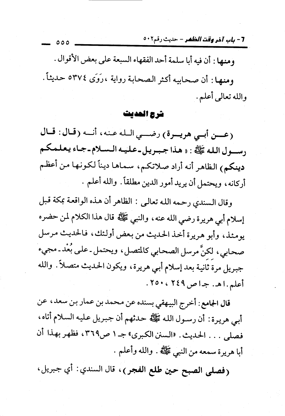 وقال السندي رحمه الله تعالى: الظاهر أن هذه الواقعة بمكة قبل إسلام أبي هريرة رضي الله عنه، والنبي - صلى الله عليه وسلم - قال هذا الكلام لمن حضره يومئذ، وأبو هريرة أخذ الحديث من بعض أولئك، فالحديث مرسل صحابي، لِكِنَّ مرسل الصحابى كالمتصل، ويحتمل -على بُعْد- مجيء جبريل مرة ثانية بعد إسلام أبي هريرة، ويكون الحديث متصلًا. والله أعلم. اهـ. جـ 1 ص249، 250.