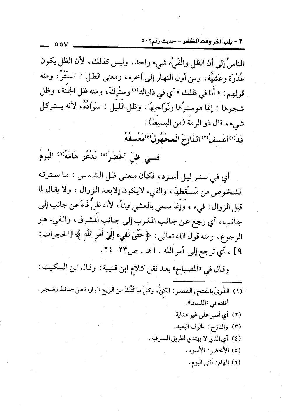 أي في ستر ليل أسود، فكأن معنى ظل الشمس: ما سترته الشخوص من مَسْقِطِهَا، والفيء لا يكون إلا بعد الزوال، ولا يقال لما قبل الزوال: فيء، وإنما سمي بالعشي فيئًا، لأنه ظِلٌّ فَاءَ عن جانب إلى جانب، أي رجع عن جانب المغرب إلى جانب المشرق، والفيء هو الرجوع، ومنه قول الله تعالى: {حَتَّى تَفِيءَ إِلَى أَمْرِ اللَّهِ} [الحجرات: 9]، أي ترجع إلى أمر الله. اهـ. ص 23 - 24.