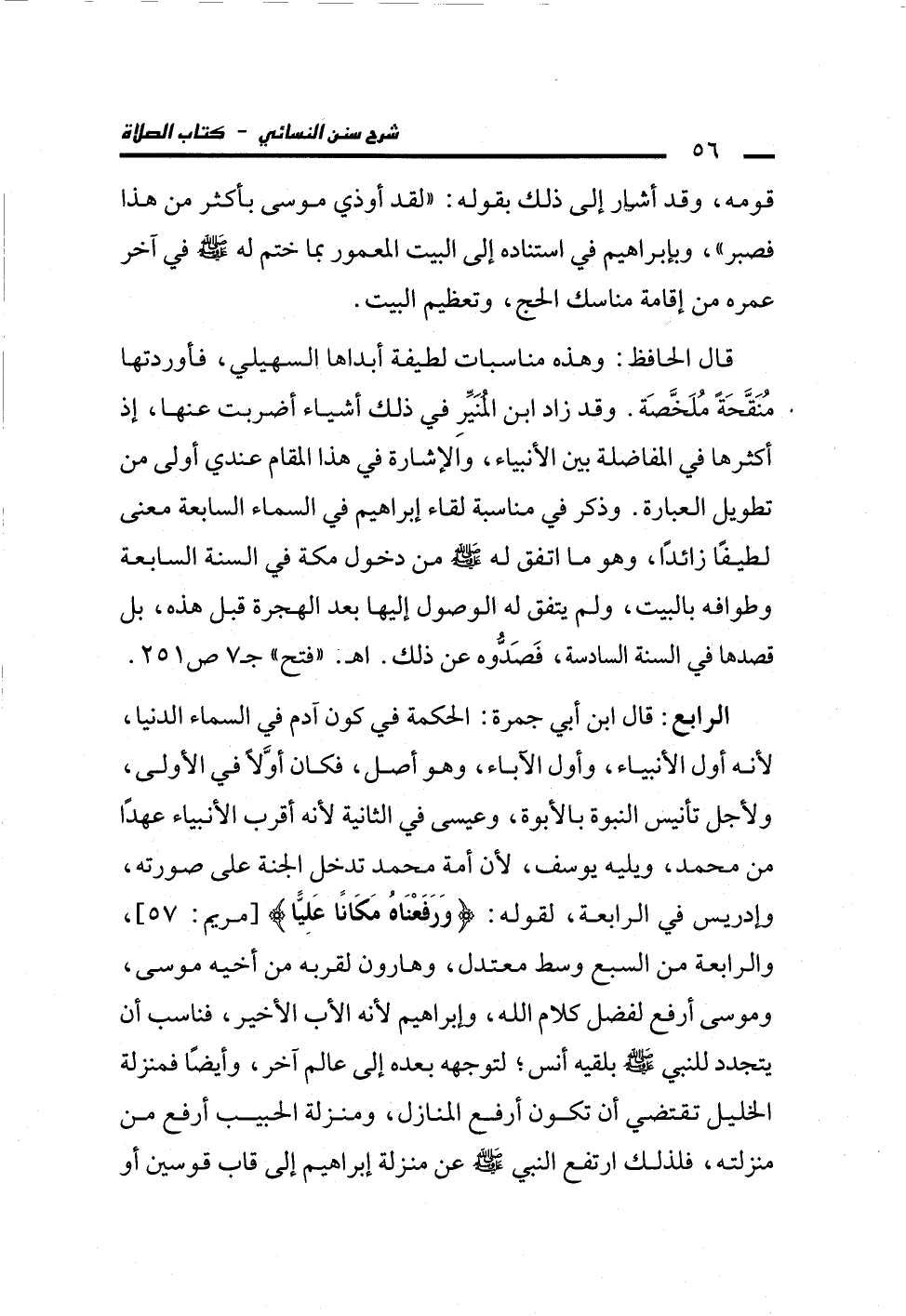 قال الحافظ: وهذه مناسبات لطيفة أبداها السهيلي، فأوردتها مُنَقَّحَةً مُلَخَّصَة. وقد زاد ابن المنَيِّرِ في ذلك أشياء أضربت عنها، إذ أكثرها في المفاضلة بين الأنبياء، والإشارة في هذا المقام عندي أولى من تطويل العبارة. وذكر في مناسبة لقاء إبراهيم في السماء السابعة معنى لطيفًا زائدًا، وهو ما اتفق له - صلى الله عليه وسلم - من دخول مكة في السنة السابعة وطوافه بالبيت، ولم يتفق له الوصول إليها بعد الهجرة قبل هذه، بل قصدها في السنة السادسة، فَصَدُّوه عن ذلك. اهـ. "فتح" جـ 7 ص 251.