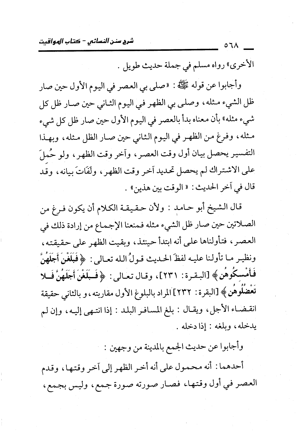 وأجابوا عن قوله - صلى الله عليه وسلم -: "صلى بي العصر في اليوم الأول حين صار ظل الشيء مثله" وصلى بي الظهر في اليوم الثاني حين صار ظل كل شيء مثله" بأن معناه بدأ بالعصر في اليوم الأول حين صار ظل كل شيء مثله، وفرغ من الظهر في اليوم الثاني حين صار الظل مثله، وبهذا التفسير يحصل بيان أول وقت العصر، وآخر وقت الظهر، ولو حُمِلَ على الاشتراك لم يحصل تحديد آخر وقت الظهر، ولَفَاتَ بيانه، وقد قال في آخر الحديث: "الوقت بين هذين". قال الشيخ أبو حامد: ولأن حقيقة الكلام أن يكون فرغ من الصلاتين حين صار ظل الشيء مثله فمنعنا الإجماع من إرادة ذلك في العصر، فتأولناها على أنه ابتدأ حينئذ، وبقيت الظهر على حقيقته، ونظير ما تأولنا عليه لفظَ الحديث قولُ الله تعالى: {فَبَلَغْنَ أَجَلَهُنَّ فَأَمْسِكُوهُنَّ} [البقرة: 231]، وقال تعالى: {فَبَلَغْنَ أَجَلَهُنَّ فَلَا تَعْضُلُوهُنَّ} [البقرة: 232] المراد بالبلوغ الأول مقاربته، وبالثاني حقيقة انقضاء الأجل، ويقال: بلغ المسافر البلد: إذا انتهى إليه، وإن لم يدخله، وبلغه: إذا دخله.
