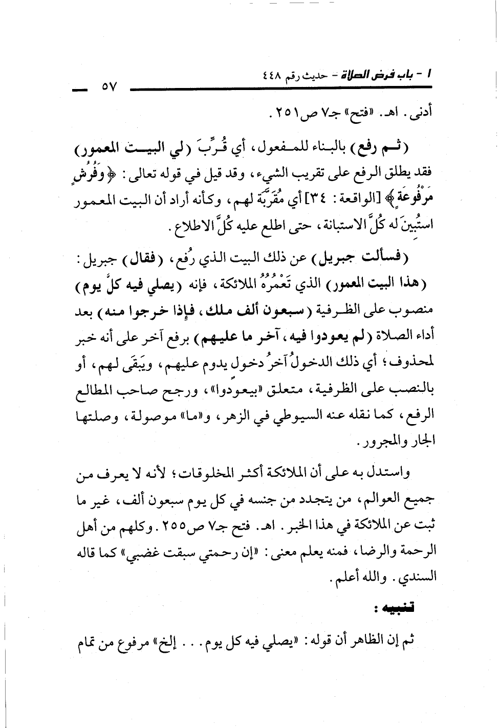 (فسألت جبريل) عن ذلك البيت الذي رُفع، (فقال) جبريل: (هذا البيت العمور) الذي تَعْمُرُهُ الملائكة، فإنه (يصلي فيه كلَّ يوم) منصوب على الظرفية (سبعون ألف ملك، فإِذا خرجوا منه) بعد أداء الصلاة (لم يعودوا فيه، آخر ما عليهم) برفع آخر على أنه خبر لمحذوف؛ أي ذلك الدخولُ آخرُ دخولٍ يدوم عليهم، ويَبقَى لهم، أو بالنصب على الظرفية، متعلق "بيعودوا"، ورجح صاحب المطالع الرفع، كما نقله عنه السيوطي في الزهر، و"ما" موصولة، وصلتها الجار والمجرور.