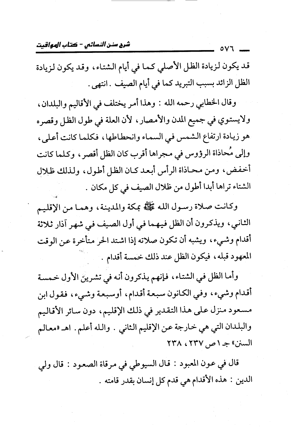 وأما الظل في الشتاء، فإنهم يذكرون أنه في تشريق الأول خمسة أقدام وشيء، وفي الكانون سبعة أقدام، أو سبعة وشيء، فقول ابن مسعود منزل على هذا التقدير في ذلك الإقليم، دون سائر الأقاليم والبلدان التي هي خارجة عن الإقليم الثاني. والله أعلم. اهـ "معالم السنن" جـ 1 ص 237، 238