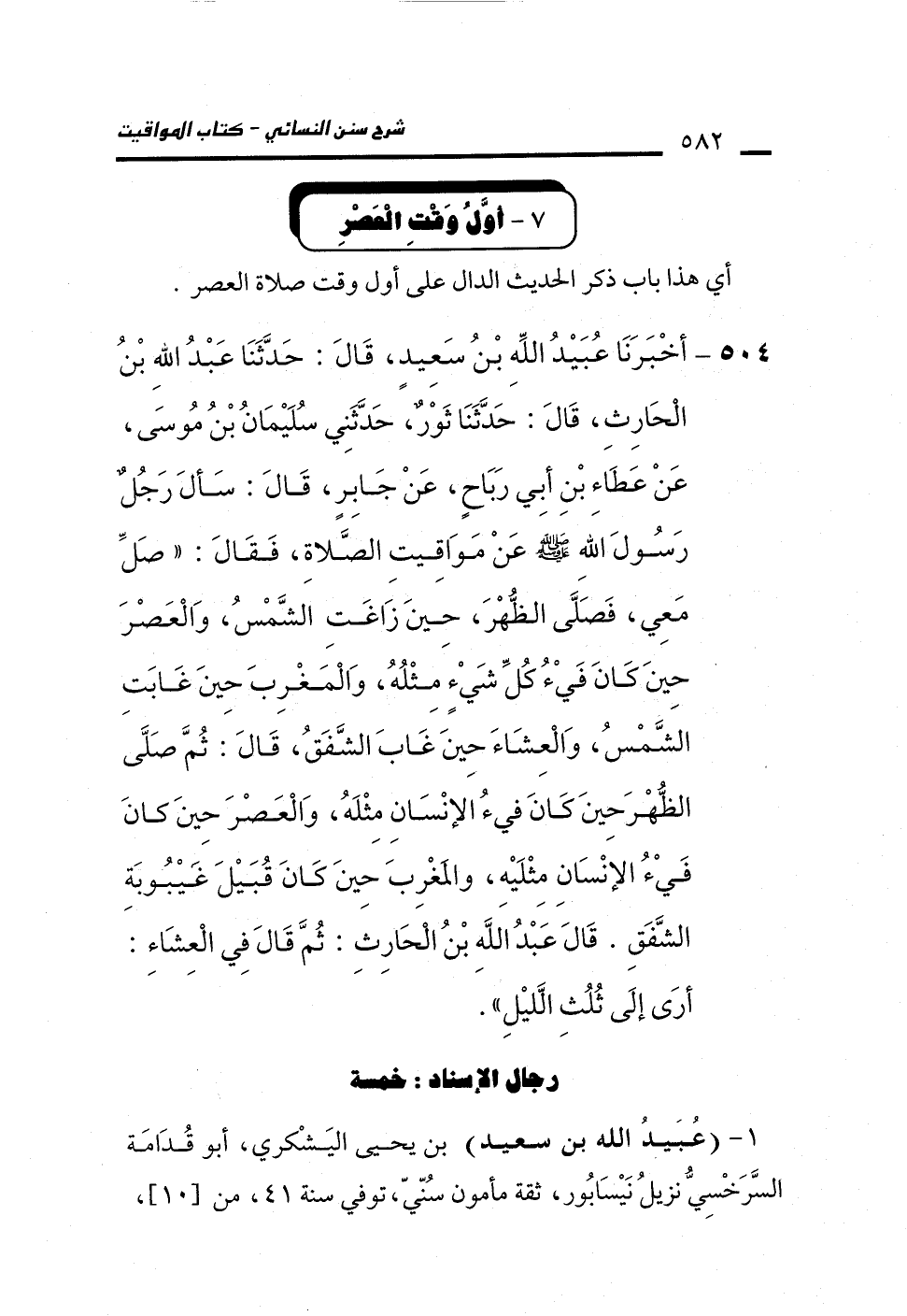 504 - أَخْبَرَنَا عُبَيْدُ اللهِ بْنُ سَعِيدٍ، قَالَ: حَدَّثَنَا عَبْدُ اللهِ بْنُ الْحَارِثِ، قَالَ: حَدَّثَنَا ثَوْرٌ، حَدَّثَنِي سُلَيْمَانُ بْنُ مُوسَى، عَنْ عَطَاءِ بْنِ أَبِي رَبَاحٍ، عَنْ جَابِرٍ، قَالَ: سَأَلَ رَجُلٌ رَسُولَ اللهِ - صلى الله عليه وسلم - عَنْ مَوَاقِيتِ الصَّلاَةِ، فَقَالَ: "صَلِّ مَعِي، فَصَلَّى الظُّهْرَ، حِينَ زَاغَتِ الشَّمْسُ، وَالْعَصْرَ حِينَ كَانَ فَيْءُ كُلِّ شَيْءٍ مِثْلَهُ، وَالْمَغْرِبَ حِينَ غَابَتِ الشَّمْسُ، وَالْعِشَاءَ حِينَ غَابَ الشَّفَقُ، قَالَ: ثُمَّ صَلَّى الظُّهْرَ حِينَ كَانَ فَيْءُ الإِنْسَانِ مِثْلَهُ، وَالْعَصْرَ حِينَ كَانَ فَيْءُ الإِنْسَانِ مِثْلَيْهِ، وَالْمَغْرِبَ حِينَ كَانَ قُبَيْلَ غَيْبُوبَةِ الشَّفَقِ. قَالَ عَبْدُ اللهِ بْنُ الْحَارِثِ: ثُمَّ قَالَ فِي الْعِشَاءِ: أُرَى إِلَى ثُلُثِ اللَّيْلِ".