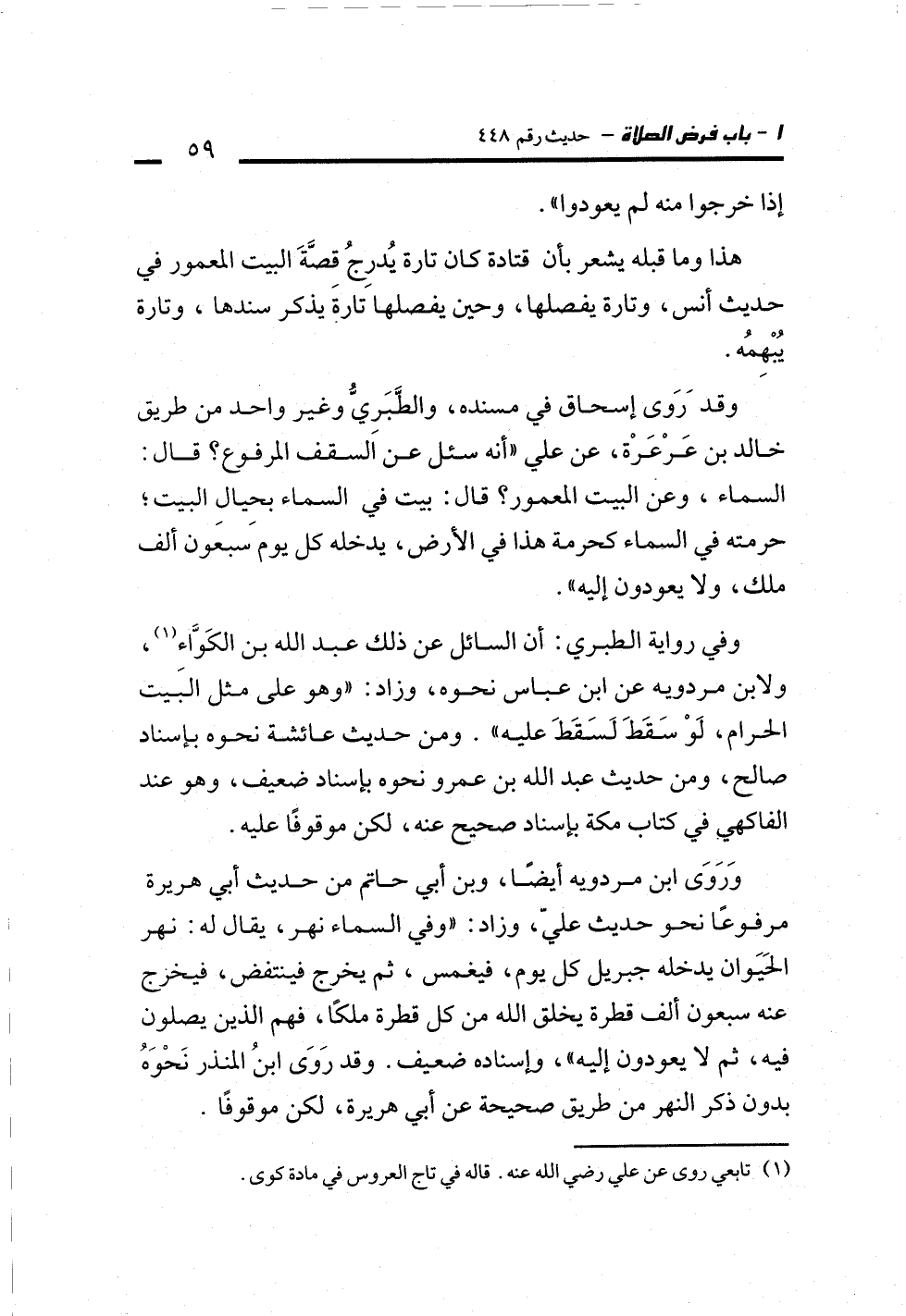 وقدَ رَوَى إسحاق في مسنده، والطَّبَريُّ وغير واحد من طريق خالد بن عَرْعَرْة، عن علي "أنه سئل عن السقف المرفوع؟ قال: السماء، وعن البيت المعمور؟ قال: بيت في السماء بحِيالِ البيت؛ حرمته في السماء كحرمة هذا في الأرض، يدخله كل يوم سبعون ألف ملك، ولا يعودون إليه".