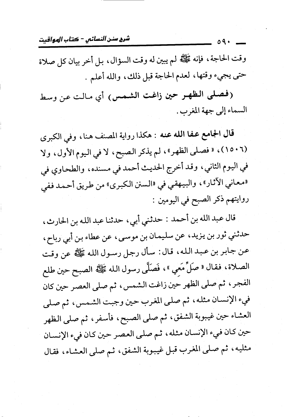 قال عبد الله بن أحمد: حدثني أبي، حدثنا عبد الله بن الحارث، حدثني ثور بن يزيد، عن سليمان بن موسى، عن عطاء بن أبي رباح، عن جابر بن عبد الله، قال: سأل رجل رسول الله - صلى الله عليه وسلم - عن وقت الصلاة، فقال "صَلِّ مَعِي"، فَصَلَّى رسول الله - صلى الله عليه وسلم - الصبح حين طلع الفجر، ثم صلى الظهر حين زاغت الشمس، ثم صلى العصر حين كان فيء الإنسان مثله، ثم صلى المغرب حين وجبت الشمس، ثم صلى العشاء حين غيبوبة الشفق، ثم صلى الصبح، فأسفر، ثم صلى الظهر حين كان فيء الإنسان مثله، ثم صلى العصر حين كان فيء الإنسان مثليه، ثم صلى المغرب قبل غيبوبة الشفق، ثم صلى العشاء، فقال