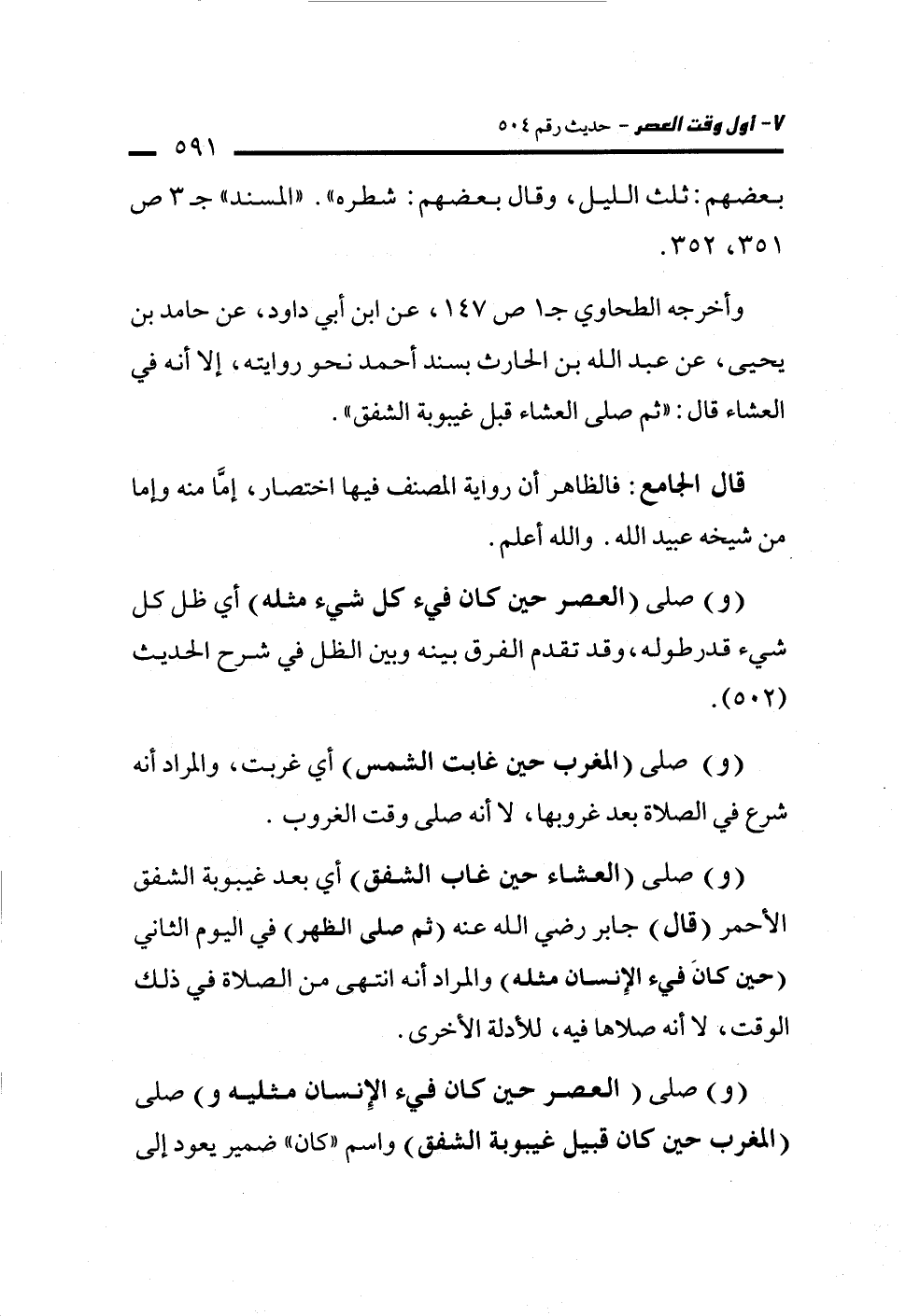 (و) صلى (العصر حين كان فيء كل شيء مثله) أي ظل كل شيء قدر طوله، وقد تقدم الفرق بينه وبين الظل في شرح الحديث (502).