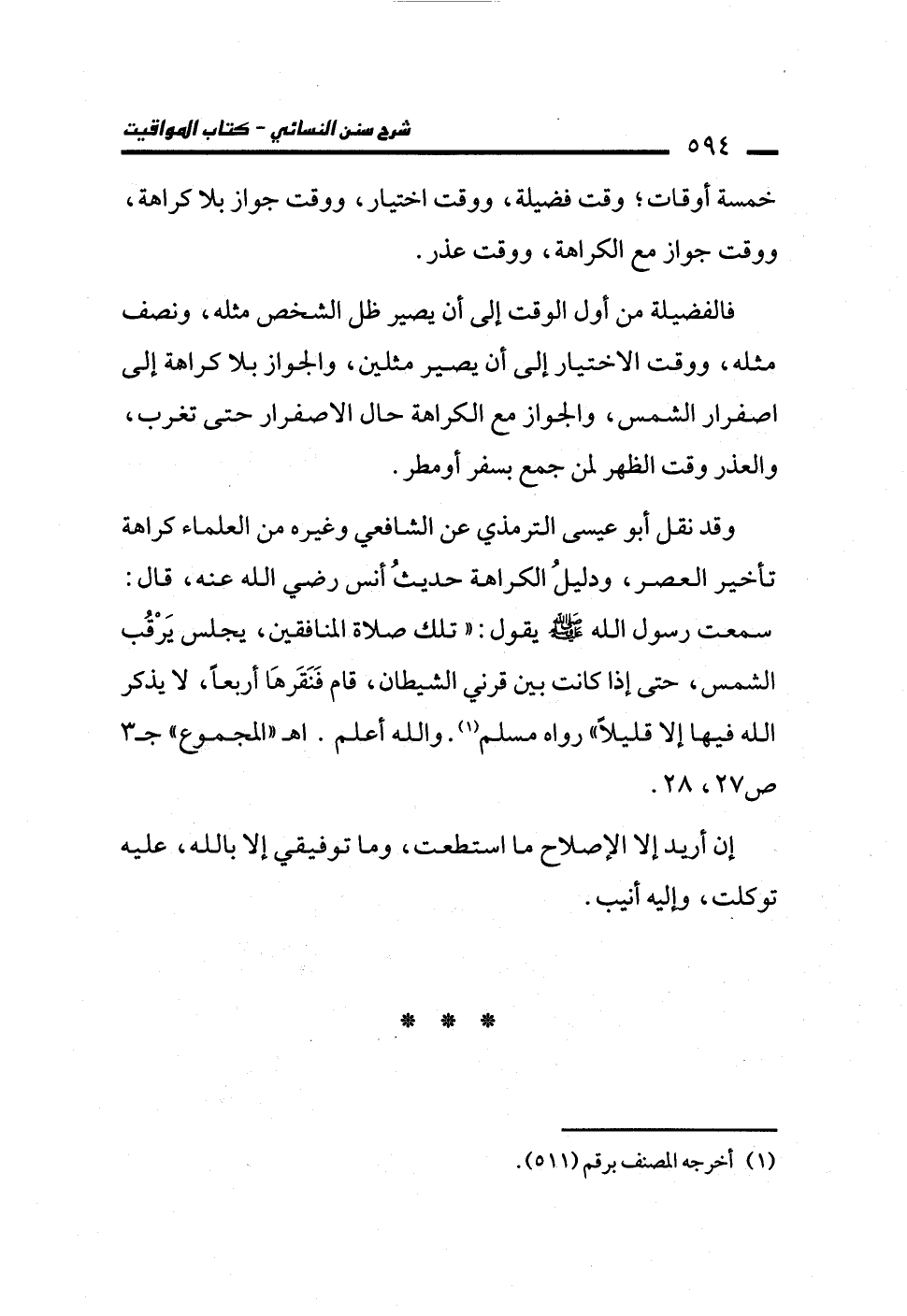 وقد نقل أبو عيسى الترمذي عن الشافعي وغيره من العلماء كراهة تأخير العصر، ودليلُ الكراهة حديثُ أنس رضي الله عنه، قال: سمعت رسول الله - صلى الله عليه وسلم - يقول: "تلك صلاة المنافقين، يجلس يَرْقُب الشمس، حتى إذا كانت بين قرني الشيطان، قام فَنَقَرهَا أربعًا، لا يذكر الله فيها إلا قليلًا" رواه مسلم (¬1). والله أعلم. اهـ "المجموع" جـ 3 ص 27، 28.
