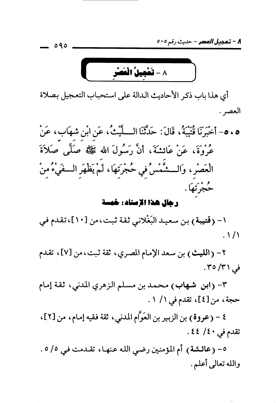 505 - أَخْبَرَنَا قُتَيْبَةُ، قَالَ: حَدَّثَنَا اللَّيْثُ، عَنِ ابْنِ شِهَابٍ، عَنْ عُرْوَةَ، عَنْ عَائِشَةَ، أَنَّ رَسُولَ اللهِ - صلى الله عليه وسلم - صَلَّى صَلاَةَ الْعَصْرِ، وَالشَّمْسُ فِي حُجْرَتِهَا، لَمْ يَظْهَرِ الْفَيْءُ مِنْ حُجْرَتِهَا.