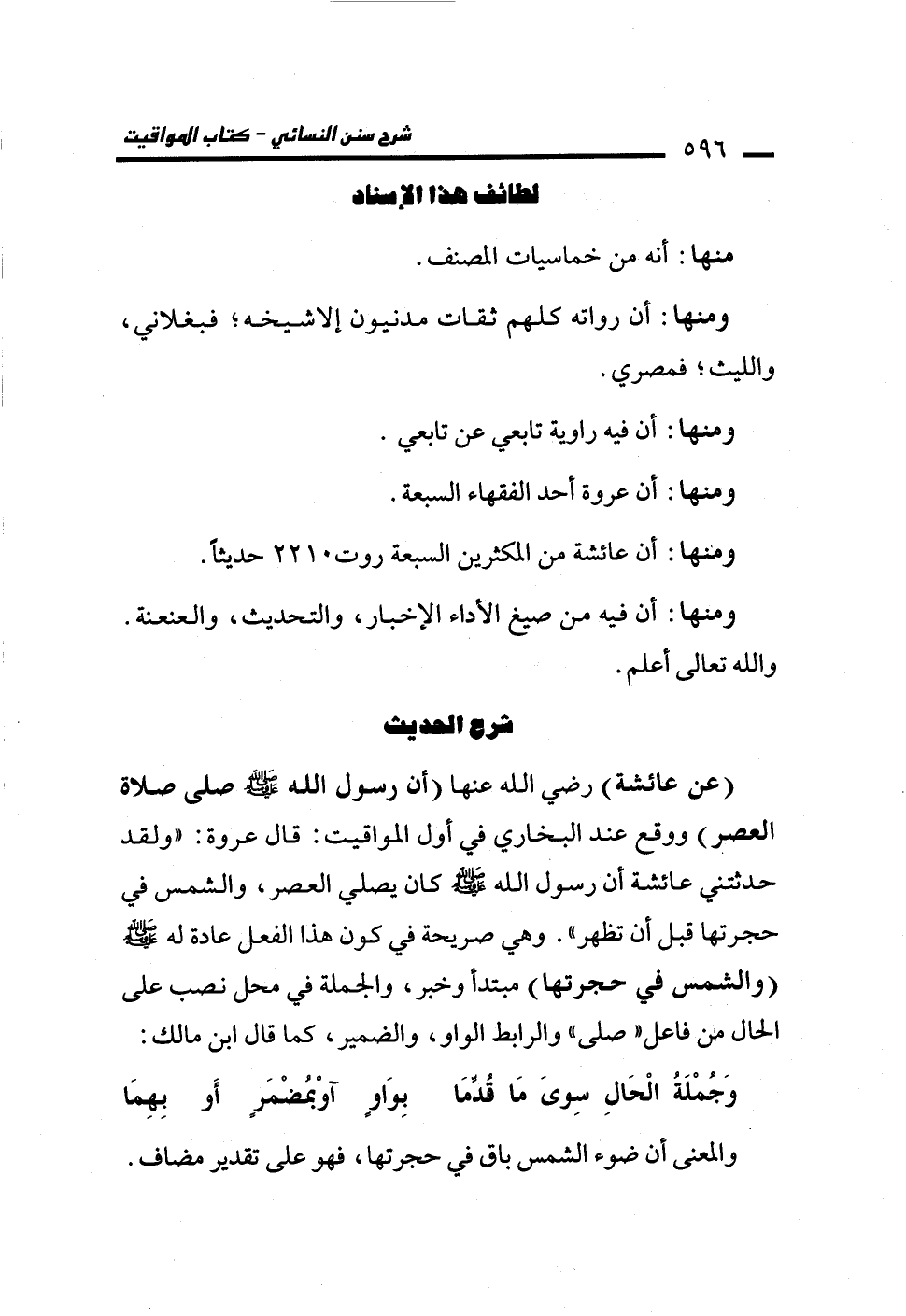 (عن عائشة) رضي الله عنها (أن رسول الله - صلى الله عليه وسلم - صلى صلاة العصر) ووقع عند البخاري في أول المواقيت: قال عروة: "ولقد حدثتني عائشة أن رسول الله - صلى الله عليه وسلم - كان يصلي العصر، والشمس في حجرتها قبل أن تظهر". وهي صريحة في كون هذا الفعل عادة له - صلى الله عليه وسلم - (والشمس في حجرتها) مبتدأ وخبر، والجملة في محل نصب على الحال من فاعل "صلى"، والرابط الواو، والضمير، كما قال ابن مالك:
