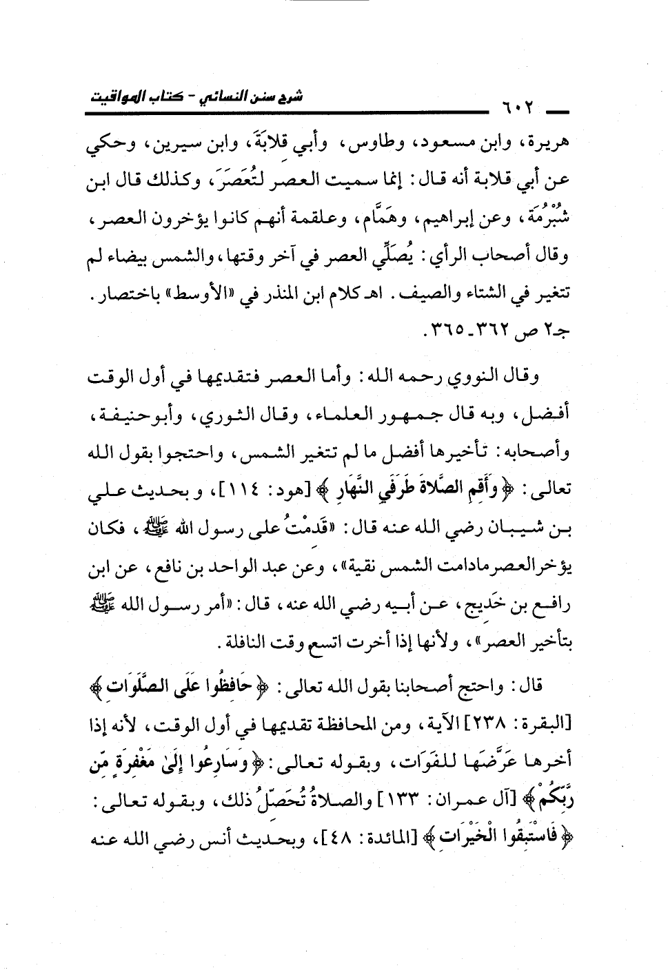 وقال النووي رحمه الله: وأما العصر فتقديمها في أول الوقت أفضل، وبه قال جمهور العلماء، وقال الثوري، وأبو حنيفة، وأصحابه: تأخيرها أفضل ما لم تتغير الشمس، واحتجوا بقول الله تعالى: {وَأَقِمِ الصَّلَاةَ طَرَفَيِ النَّهَارِ} [هود: 114]، وبحديث علي بن شيبان رضي الله عنه قال: "قَدِمْتُ على رسول الله - صلى الله عليه وسلم -، فكان يؤخر العصر مادامت الشمس نقية"، وعن عبد الواحد بن نافع، عن ابن رافع بن خَدِيج، عن أبيه رضي الله عنه، قال: "أمر رسول الله - صلى الله عليه وسلم - بتأخير العصر"، ولأنها إذا أخرت اتسع وقت النافلة.