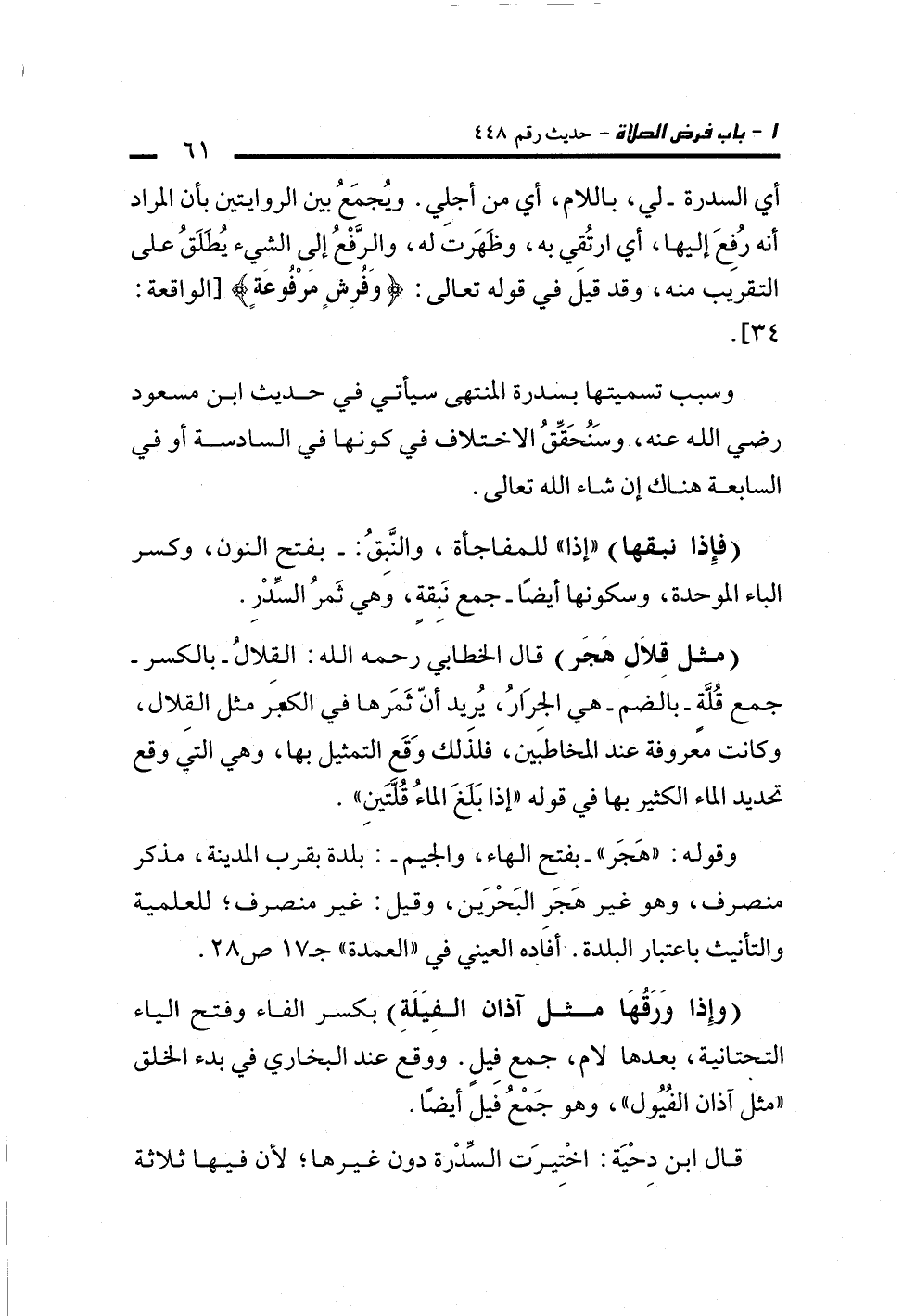 (مثل قِلاَلِ هَجَر) قال الخطابي رحمه الله: القلالُ -بالكسر- جمع قُلَّةٍ -بالضم- هي الجِرَارُ، يُريد أنّ ثَمَرها في الكبَر مثل القِلال، وكانت معروفة عند المخاطبين، فلذَلك وَقَع التمثيل بها، وهي التي وقع تحديد الماء الكثير بها في قوله "إذا بَلَغَ الماءُ قُلَّتَينِ".