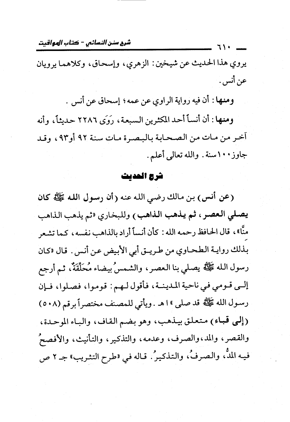 (عن أنس) بن مالك رضي الله عنه (أن رسول الله - صلى الله عليه وسلم - كان يصلي العصر، ثم يذهب الذاهب) وللبخاري "ثم يذهب الذاهب مِنَّا"، قال الحافظ رحمه الله: كأن أنسًا أراد بالذاهب نفسه، كما تشعر بذلك رواية الطحاوي من طريق أبي الأبيض عن أنس. قال "كان رسول الله - صلى الله عليه وسلم - يصلي بنا العصر، والشمسُ بيضاء مُحَلِّقَةٌ، ثم أرجع إلى قومي في ناحية المدينة، فأقول لهم: قوموا، فصلوا، فإن رسول الله - صلى الله عليه وسلم - قد صلى" اهـ. ويأتي للمصنف مختصرًا برقم (508) (إِلى قباء) متعلق بيذهب، وهو بضم القاف، والباء الموحدة، والقصر، والمد، والصرف، وعدمه، والتذكير، والتأنيث، والأفصحُ فيه المدُّ، والصرفُ، والتذكيرُ. قاله في "طرح التثريب" جـ 2 ص