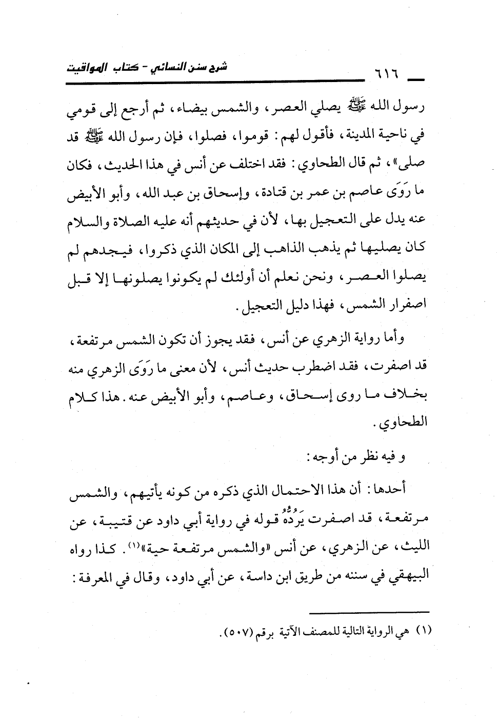 رسول الله - صلى الله عليه وسلم - يصلي العصر، والشمس بيضاء، ثم أرجع إلى قومي في ناحية المدينة، فأقول لهم: قوموا، فصلوا، فإن رسول الله - صلى الله عليه وسلم - قد صلى"، ثم قال الطحاوي: فقد اختلف عن أنس في هذا الحديث، فكان ما رَوَى عاصم بن عمر بن قتادة، وإسحاق بن عبد الله، وأبو الأبيض عنه يدل على العجيل بها، لأن في حديثهم أنه عليه الصلاة والسلام كان يصليها ثم يذهب الذاهب إلى المكان الذي ذكروا، فيجدهم لم يصلوا العصر، ونحن نعلم أن أولئك لم يكونوا يصلونها إلا قبل اصفرار الشمس، فهذا دليل التعجيل.