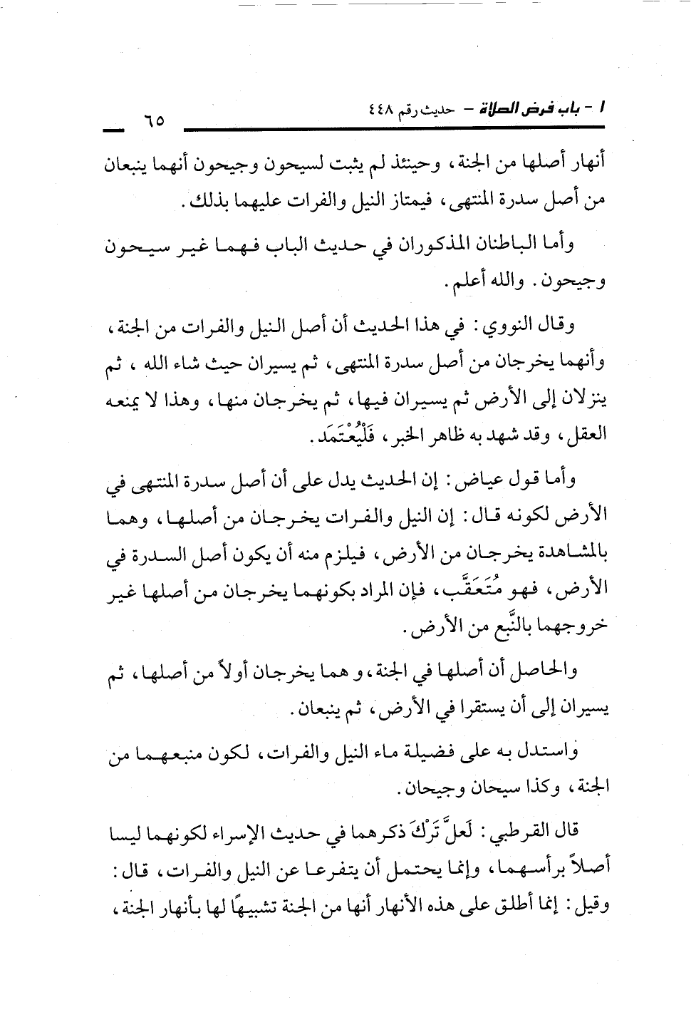 وقال النووي: في هذا الحديث أن أصل النيل والفرات من الجنة، وأنهما يخرجان من أصل سدرة المنتهى، ثم يسيران حيث شاء الله، ثم ينزلان إلى الأرض ثم يسيران فيها، ثم يخرجان منها، وهذا لا يمنعه العقل، وقد شهد به ظاهر الخبر، فَلْيُعْتَمَد.