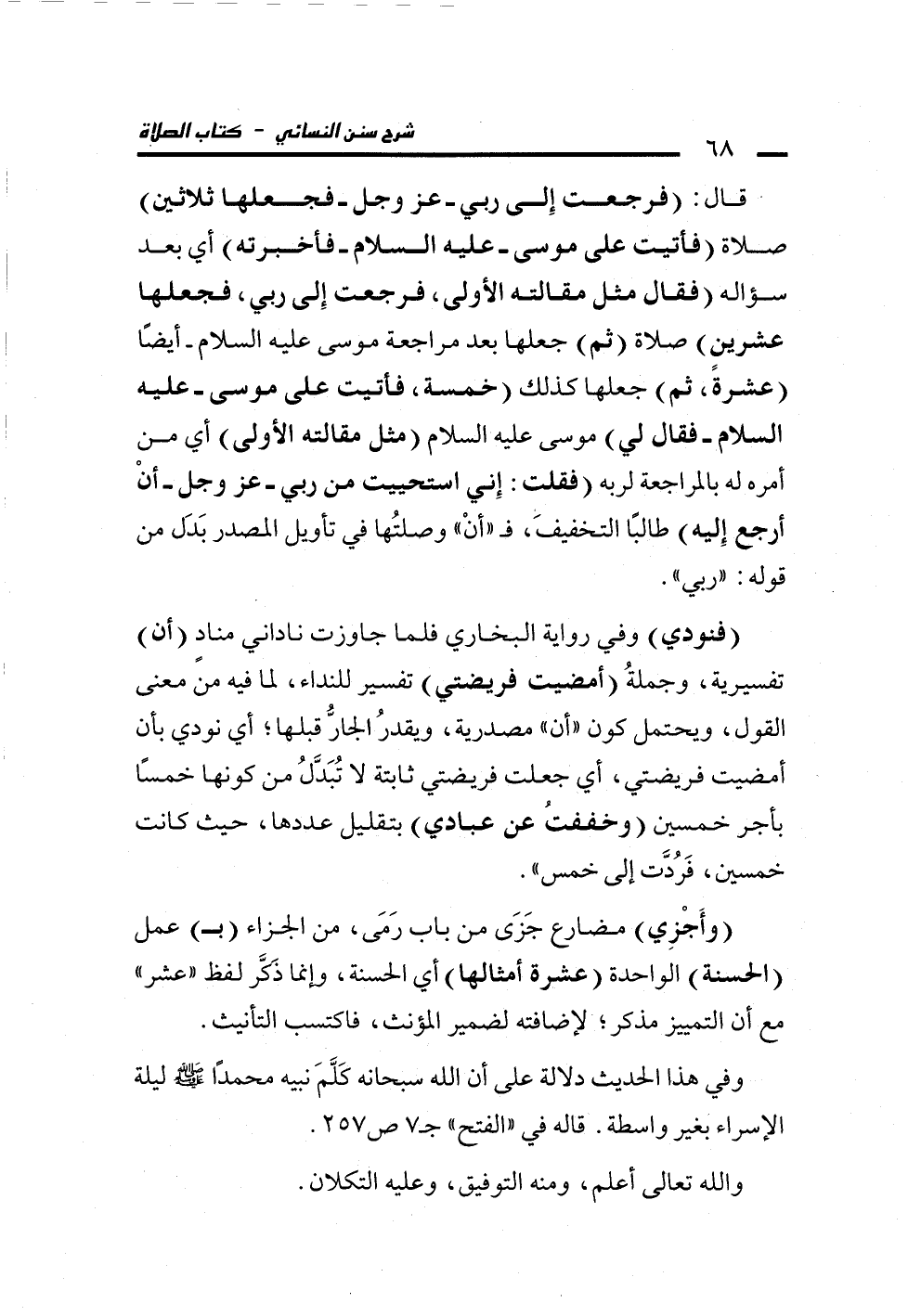 قال: (فرجعت إِلى ربي -عز وجل- فجعلها ثلاثين) صلاة (فأتيت على موسى- عليه السلام - فأخبرته) أي بعد سؤاله (فقال مثل مقالته الأولى، فرجعت إِلى ربي، فجعلها عشرين) صلاة (ثم) جعلها بعد مراجعة موسى - عليه السلام - أيضًا (عشرةً، ثم) جعلها كذلك (خمسة، فأتيت على موسى- عليه السلام - فقال لي) موسى عليه السلام (مثل مقالته الأولى) أي من أمره له بالمراجعة لربه (فقلت: إني استحييت من ربي -عز وجل- أنْ أرجع إِليه) طالبًا التخفيفَ، فـ"أنْ" وصلتُها في تأويل المصدر بَدَل من قوله: "ربي".