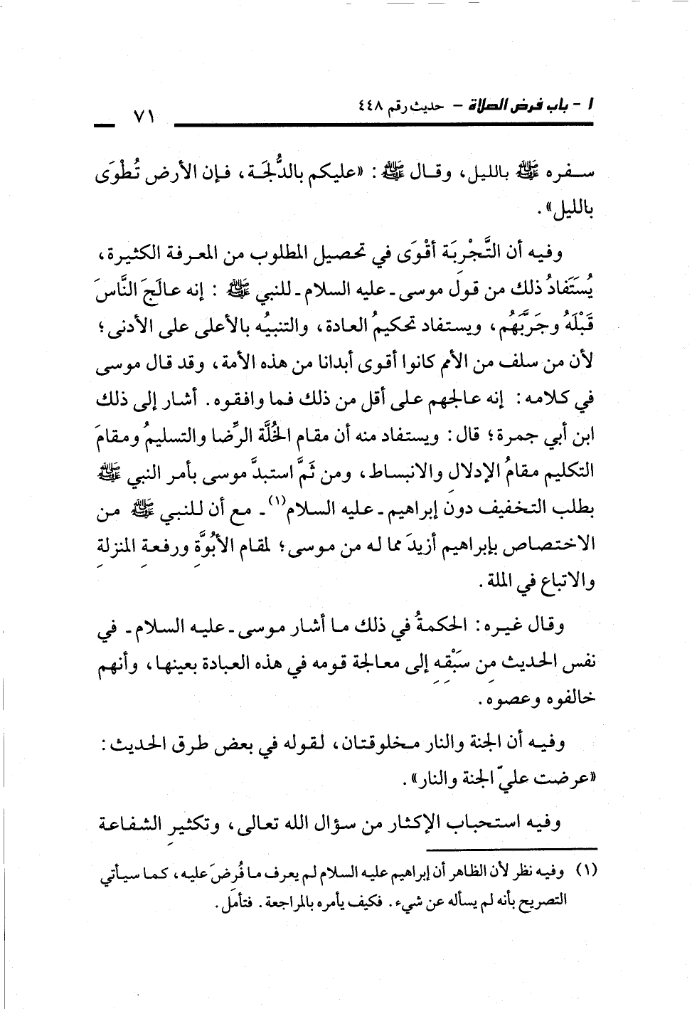 وفيه أن التَّجْربَة أقْوَى في تحصيل المطلوب من المعرفة الكثيرة، يُسَتَفادُ ذلك من قوَل موسى - عليه السلام - للنبي - صلى الله عليه وسلم -: إنه عالَجَ النَّاسَ قَبْلَهُ وجَرَّبَهُم، ويستفاد تحكيمُ العادة، والتنبيُه بالأعلى على الأدنى؛ لأن من سلف من الأم كانوا أقوى أبدانا من هذه الأمة، وقد قال موسى في كلامه: إنه عالجهم على أقل من ذلك فما وافقوه. أشار إلى ذلك ابن أبي جمرة؛ قال: ويستفاد منه أن مقام الخُلَّة الرِّضا والتسليمُ ومقامَ