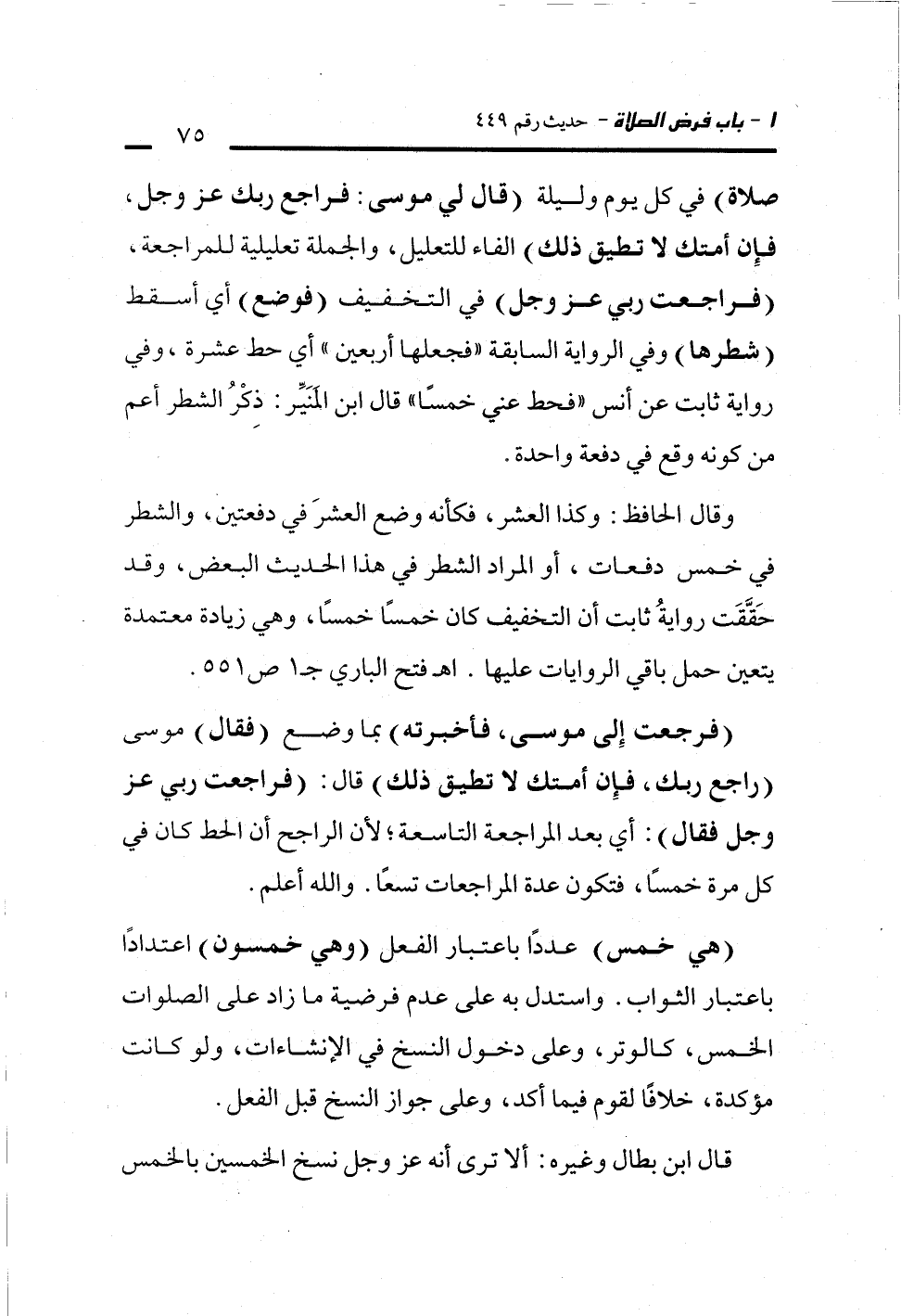 (هي خمس) عددًا باعتبار الفعل (وهي خمسون) اعتدادًا باعتبار الثواب. واستدل به على عدم فرضية ما زاد على الصلوات الخمس، كالوتر، وعلى دخول النسخ في الإنشاءات، ولو كانت مؤكدة، خلافًا لقوم فيما أكد، وعلى جواز النسخ قبل الفعل.