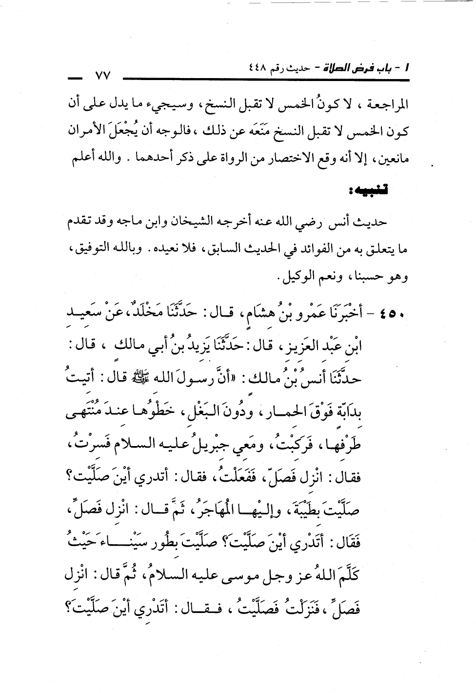 450 - أَخْبَرَنَا عَمْرُو بْنُ هِشَامٍ، قَالَ: حَدَّثَنَا مَخْلَدٌ، عَنْ سَعِيدِ بْنِ عَبْدِ الْعَزِيزِ، قَالَ: حَدَّثَنَا يَزِيدُ بْنُ أَبِي مَالِكٍ، قَالَ: حَدَّثَنَا أَنَسُ بْنُ مَالِكٍ: أَنَّ رَسُولَ اللهِ - صلى الله عليه وسلم - قَالَ: "أُتِيتُ بِدَابَّةٍ فَوْقَ الْحِمَارِ، وَدُونَ الْبَغْلِ، خَطْوُهَا عِنْدَ مُنْتَهَى طَرْفِهَا، فَرَكِبْتُ، وَمَعِي جِبْرِيلُ عَلَيْهِ السَّلاَمُ فَسِرْتُ، فَقَالَ: انْزِلْ فَصَلّ، فَفَعَلْتُ، فَقَالَ: أَتَدْرِي أَيْنَ صَلَّيْتَ؟ صَلَّيْتَ بِطَيْبَةَ، وَإِلَيْهَا الْمُهَاجَرُ، ثُمَّ قَالَ: انْزِلْ فَصَلِّ، فَقَالَ: أَتَدْرِى أَيْنَ صَلَّيْتَ؟ صَلَّيْتَ بِطُورِ سَيْنَاءَ حَيْثُ كَلَّمَ اللهُ عَزَّ وَجَلَّ مُوسَى عَلَيْهِ السَّلاَمُ، ثُمَّ قَالَ: انْزِلْ فَصَلِّ، فَنَزَلْتُ فَصَلَّيْتُ، فَقَالَ: أَتَدْرِي أَيْنَ صَلَّيْتَ؟
