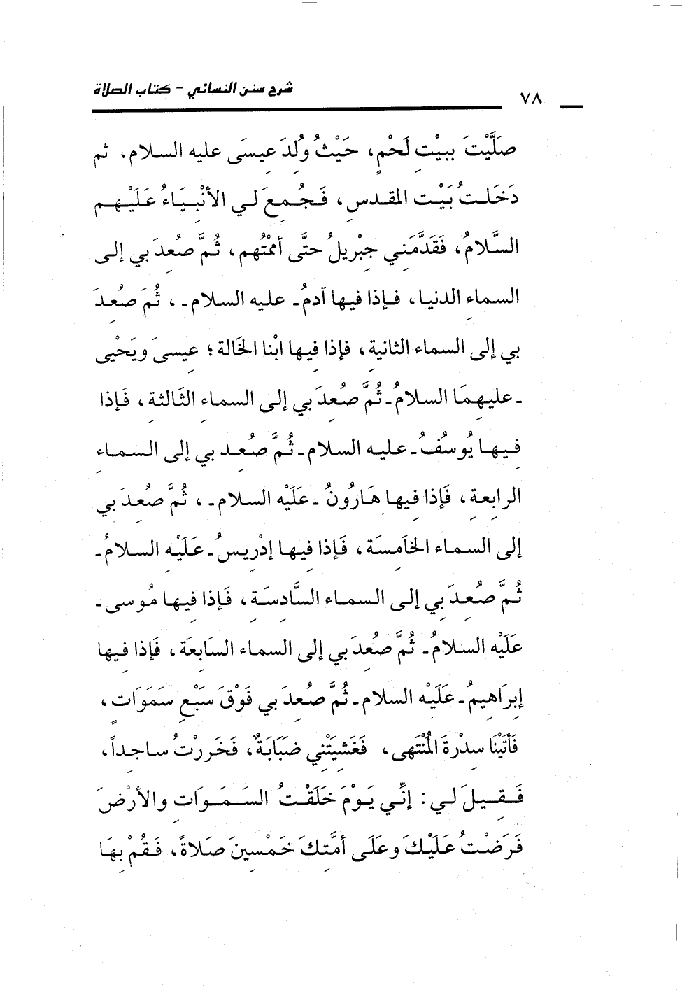 صَلَّيْتَ بِبَيْتِ لَحْمٍ، حَيْثُ وُلِدَ عِيسَى عَلَيْهِ السَّلاَمُ، ثُمَّ دَخَلْتُ بَيْتَ الْمَقْدِسِ، فَجُمِعَ لِيَ الأَنْبِيَاءُ عَلَيْهِمُ السَّلاَمُ، فَقَدَّمَنِي جِبْرِيلُ حَتَّى أَمَمْتُهُمْ، ثُمَّ صُعِدَ بِي إِلَى السَّمَاءِ الدُّنْيَا، فَإِذَا فِيهَا آدَمُ -عَلَيْهِ السَّلاَمُ-، ثُمَّ صُعِدَ بِي إِلَى السَّمَاءِ الثَّانِيَةِ، فَإِذَا فِيهَا ابْنَا الْخَالَةِ، عِيسَى وَيَحْيَى -عَلَيْهِمَا السَّلاَمُ- ثُمَّ صُعِدَ بِي إِلَى السَّمَاءِ الثَّالِثَةِ، فَإِذَا فِيهَا يُوسُفُ -عَلَيْهِ السَّلاَمُ- ثُمَّ صُعِدَ بِي إِلَى السَّمَاءِ الرَّابِعَةِ، فَإِذَا فِيهَا هَارُونُ -عَلَيْهِ السَّلاَمُ- ثُمَّ صُعِدَ بِي إِلَى السَّمَاءِ الْخَامِسَةِ، فَإِذَا فِيهَا إِدْرِيسُ -عَلَيْهِ السَّلاَمُ- ثُمَّ صُعِدَ بِي إِلَى السَّمَاءِ السَّادِسَةِ، فَإِذَا فِيهَا مُوسَى -عَلَيْهِ السَّلاَمُ- ثُمَّ صُعِدَ بِي إِلَى السَّمَاءِ السَّابِعَةِ، فَإِذَا فِيهَا إِبْرَاهِيمُ -عَلَيْهِ السَّلاَمُ- ثُمَّ صُعِدَ بِي فَوْقَ سَبْعِ سَمَوَاتٍ، فَأَتَيْنَا سِدْرَةَ الْمُنْتَهَى، فَغَشِيَتْنِي ضَبَابَةٌ، فَخَرَرْتُ سَاجِدًا، فَقِيلَ لِي: إِنِّي يَوْمَ خَلَقْتُ السَّمَوَاتِ وَالأَرْضَ فَرَضْتُ عَلَيْكَ وَعَلَى أُمَّتِكَ خَمْسِينَ صَلاَةً، فَقُمْ بِهَا