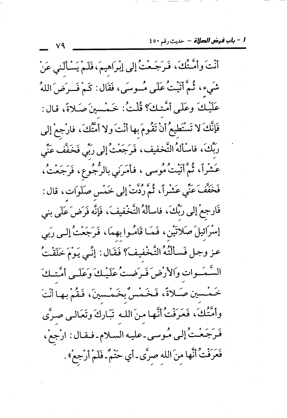 أَنْتَ وَأُمَّتُكَ، فَرَجَعْتُ إِلَى إِبْرَاهِيمَ، فَلَمْ يَسْأَلْنِي عَنْ شَيْءٍ، ثُمَّ أَتَيْتُ عَلَى مُوسَى، فَقَالَ: كَمْ فَرَضَ اللهُ عَلَيْكَ وَعَلَى أُمَّتِكَ؟ قُلْتُ: خَمْسِينَ صَلاَةً، قَالَ: فَإِنَّكَ لاَ تَسْتَطِيعُ أَنْ تَقُومَ بِهَا أَنْتَ وَلاَ أُمَّتُكَ، فَارْجِعْ إِلَى رَبِّكَ، فَاسْأَلْهُ التَّخْفِيفَ، فَرَجَعْتُ إِلَى رَبِّي فَخَفَّفَ عَنِّي عَشْرًا، ثُمَّ أَتَيْتُ مُوسَى، فَأَمَرَنِي بِالرُّجُوعِ، فَرَجَعْتُ، فَخَفَّفَ عَنِّى عَشْرًا، ثُمَّ رُدَّتْ إِلَى خَمْسِ صَلَوَاتٍ، قَالَ: فَارْجِعْ إِلَى رَبِّكَ، فَاسْأَلْهُ التَّخْفِيفَ، فَإِنَّهُ فَرَضَ عَلَى بَنِي إِسْرَائِيلَ صَلاَتَيْنِ، فَمَا قَامُوا بِهِمَا، فَرَجَعْتُ إِلَى رَبِّي عَزَّ وَجَلَّ فَسَأَلْتُهُ التَّخْفِيفَ؟ فَقَالَ: إِنِّي يَوْمَ خَلَقْتُ السَّمَوَاتِ وَالأَرْضَ فَرَضْتُ عَلَيْكَ وَعَلَى أُمَّتِكَ خَمْسِينَ صَلاَةً، فَخَمْسٌ بِخَمْسِينَ، فَقُمْ بِهَا أَنْتَ وَأُمَّتُكَ، فَعَرَفْتُ أَنَّهَا مِنَ اللهِ تَبَارَكَ وَتَعَالَى صِرَّى فَرَجَعْتُ إِلَى مُوسَى -عَلَيْهِ السَّلاَمُ- فَقَالَ: ارْجِعْ فَعَرَفْتُ أَنَّهَا مِنَ اللهِ صِرَّى -أَىْ حَتْمٌ- فَلَمْ أَرْجِعْ.