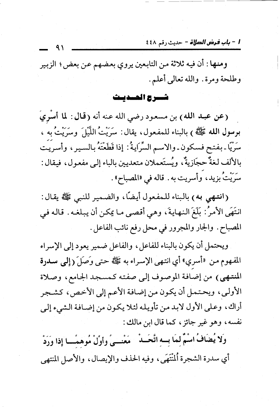 ويحتمل أن يكون بالبناء للفاعل، والفاعل ضمير يعود إلى الإسراء المفهوم من "أسرِي" أي انتهى الإسراء به - صلى الله عليه وسلم - حتى وَصَلَ (إِلى سدرة المنتهى) من إضافة الموصوف إلى صفته كمسجد الجامع، وصلاة الأولى، ويحتمل أن يكون من إضافة الأعم إلى الأخص، كشجر أراك، وعلى الأول لابد من تأويله لئلا يكون من إضافة الشيء إلى