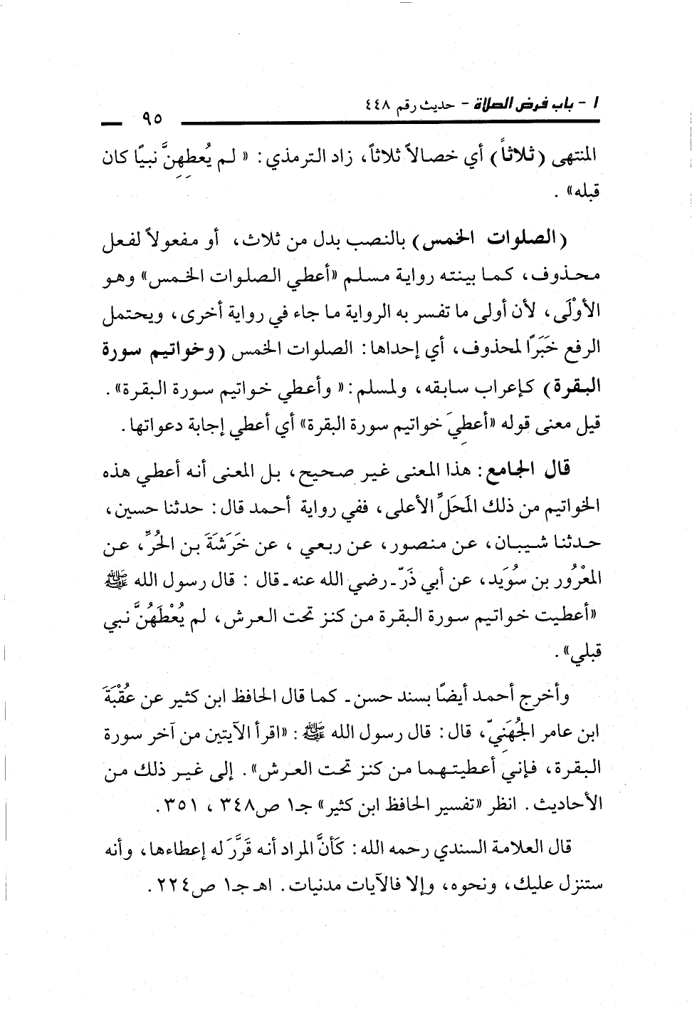 وأخرج أحمد أيضًا بسند حسن -كما قال الحافظ ابن كثير عن عُقْبَةَ ابن عامر الجُهَنِيّ، قال: قال رسول الله - صلى الله عليه وسلم -: "اقرأ الآيتين من آخر سورة البقرة، فإني أعطيتهما من كنز تحت العرش". إلى غير ذلك من الأحاديث. انظر "تفسير الحافظ ابن كثير" جـ 1 ص 348، 351.