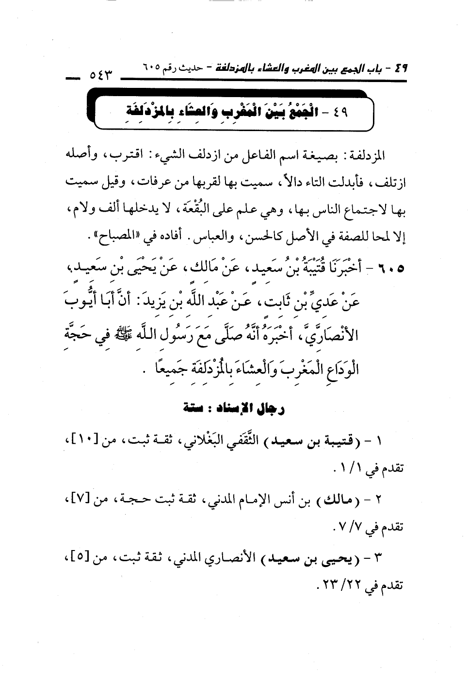 605 - أَخْبَرَنَا قُتَيْبَةُ بْنُ سَعِيدٍ، عَنْ مَالِكٍ، عَنْ يَحْيَى بْنِ سَعِيدٍ، عَنْ عَدِيِّ بْنِ ثَابِتٍ، عَنْ عَبْدِ اللهِ بْنِ يَزِيدَ: أَنَّ أَبَا أَيُّوبَ الأَنْصَارِيَّ، أَخْبَرَهُ أَنَّهُ صَلَّى مَعَ رَسُولِ اللهِ - صلى الله عليه وسلم - فِي حَجَّةِ الْوَدَاعِ الْمَغْرِبَ وَالْعِشَاءَ بِالْمُزْدَلِفَةِ جَمِيعًا.
