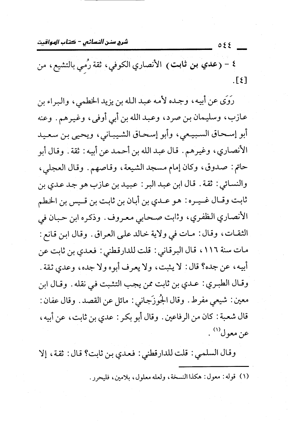 معين: شيعي مفرط. وقال الجُوزَجاني: مائل عن القصد. وقال عفان: قال شعبة: كان من الرفاعين. وقال أبو بكر: عدي بن ثابت، عن أبيه، عن معول (¬1).