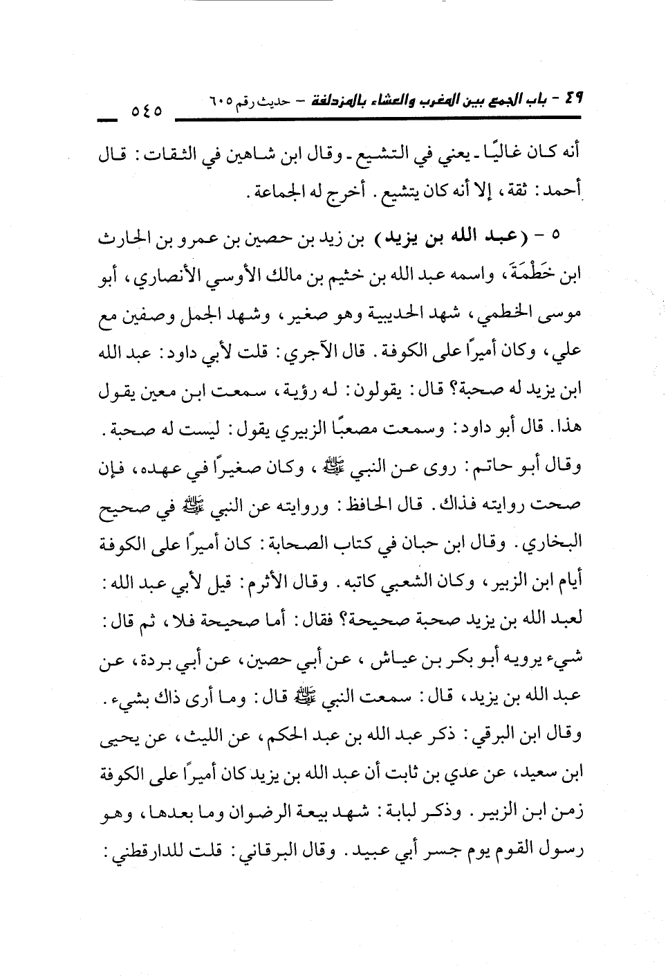5 - (عبد الله بن يزيد) بن زيد بن حصين بن عمرو بن الحارث ابن خَطْمَةَ، واسمه عبد الله بن خثيم بن مالك الأوسي الأنصاري، أبو موسى الخطمي، شهد الحديبية وهو صغير، وشهد الجمل وصفين مع علي، وكان أميرًا على الكوفة. قال الآجري: قلت لأبي داود: عبد الله ابن يزيد له صحبة؟ قال: يقولون: له رؤية، سمعت ابن معين يقول هذا. قال أبو داود: وسمعت مصعبًا الزبيري يقول: ليست له صحبة. وقال أبو حاتم: روى عن النبي - صلى الله عليه وسلم -، وكان صغيرًا في عهده، فإن صحت روايته فذاك. قال الحافظ: وروايته عن النبي - صلى الله عليه وسلم - في صحيح البخاري. وقال ابن حبان في كتاب الصحابة: كان أميرًا على الكوفة أيام ابن الزبير، وكان الشعبي كاتبه. وقال الأثرم: قيل لأبي عبد الله: لعبد الله بن يزيد صحبة صحيحة؟ فقال: أما صحيحة فلا، ثم قال: شيء يرويه أبو بكر بن عياش، عن أبي حصين، عن أبي بردة، عن عبد الله بن يزيد، قال: سمعت النبي - صلى الله عليه وسلم - قال: وما أرى ذاك بشيء. وقال ابن البرقي: ذكر عبد الله بن عبد الحكم، عن الليث، عن يحيى ابن سعيد، عن عدي بن ثابت أن عبد الله بن يزيد كان أميرًا على الكوفة زمن ابن الزبير. وذكر لبابة: شهد بيعة الرضوان وما بعدها، وهو رسول القوم يوم جسر أبي عبيد. وقال البرقاني: قلت للدارقطني:
