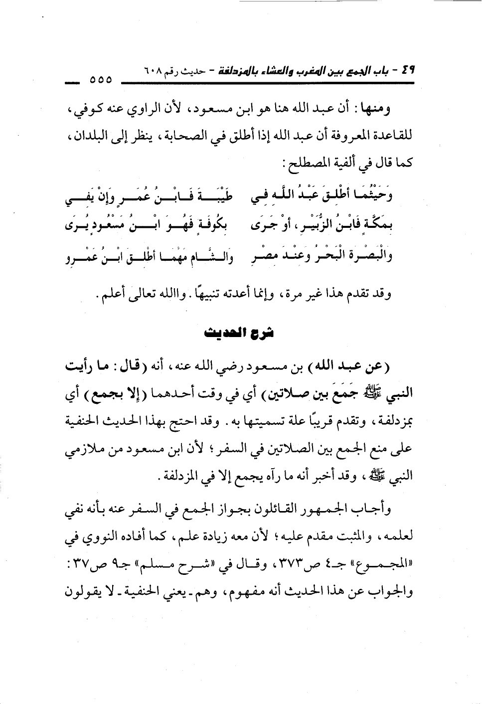 (عن عبد الله) بن مسعود رضي الله عنه، أنه (قال: ما رأيت النبي - صلى الله عليه وسلم - جَمَعَ بين صلاتين) أي في وقت أحدهما (إِلا بجمع) أي بمزدلفة، وتقدم قريبًا علة تسميتها به. وقد احتج بهذا الحديث الحنفية على منع الجمع بين الصلاتين في السفر؛ لأن ابن مسعود من ملازمي النبي - صلى الله عليه وسلم -، وقد أخبر أنه ما رآه يجمع إلا في المزدلفة.