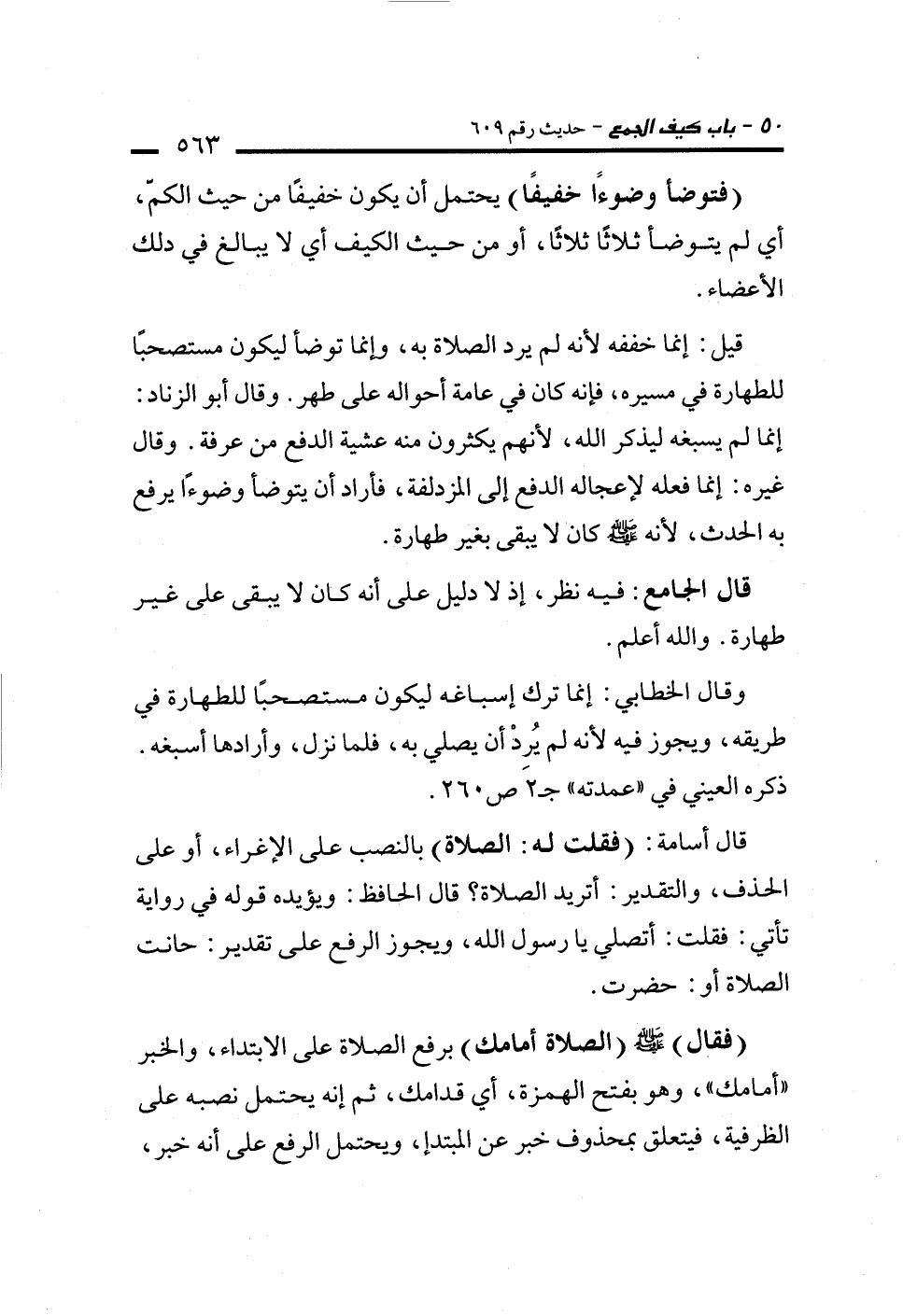 وقال الخطابي: إنما ترك إسباغه ليكون مستصحبًا للطهارة في طريقه، ويجوز فيه لأنه لم يُرِدْ أن يصلي به، فلما نزل، وأرادها أسبغه. ذكره العيني في "عمدته" جـ 2 ص 260.